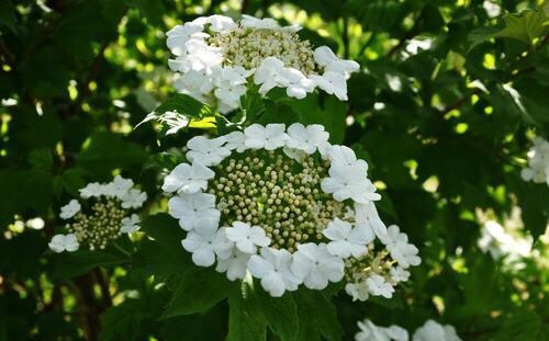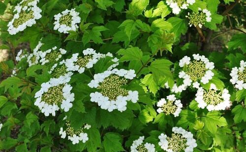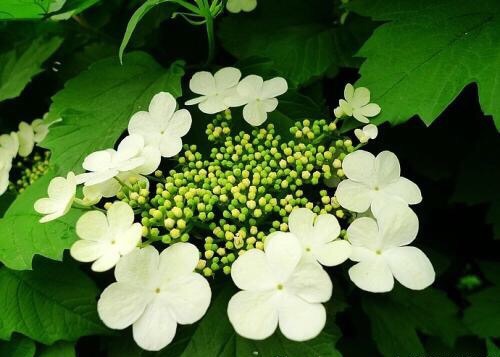 鸡条树落叶灌木,高2~3m。幼枝无毛,二年生枝带黄色或红褐色。叶宽卵形,长6~10cm,通常3裂,具掌状三出脉,基部圆形、截形或浅心形,边缘有粗牙齿,下面仅脉腋有簇聚柔毛,有时脉上也有少数柔毛;叶柄粗壮,长2~3.5cm,顶端有2~4枚腺体。复伞形式聚伞花序周围有大型的白色或淡黄色的不孕花;辐射枝6~8条,总花梗粗壮,长1~5cm;萼筒长约1mm,萼齿三角形,均无毛;可孕花雄蕊长于花冠,花药紫红色;无花柱,柱头2裂。核果红色,长8~10mm。花期5~6月,果期7~10月。