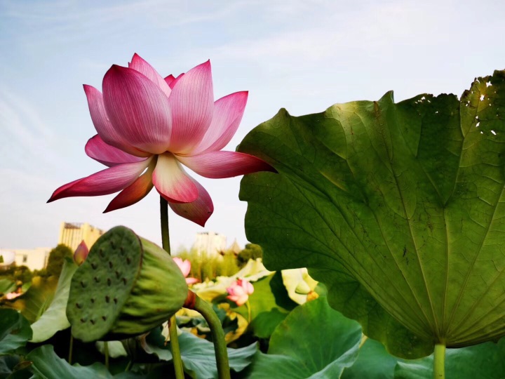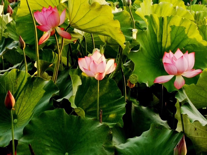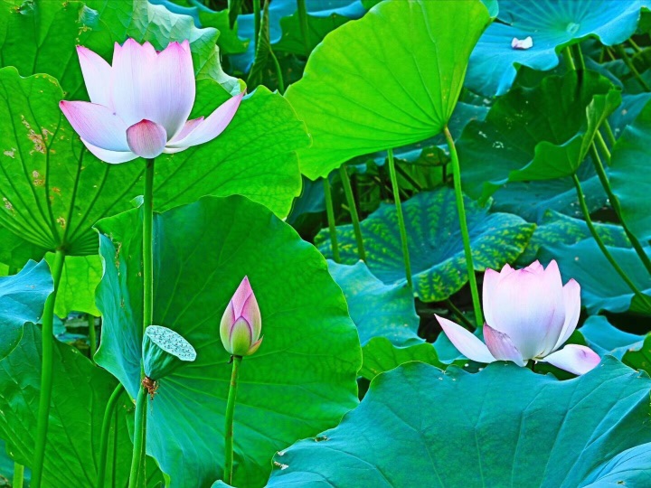 夏天,正是荷花盛开、荷叶飘香的季节。有的白如玉,有的粉似霞。白的好象少女白嫩的皮肤,又似无暇的白雪。再看粉红的,真不知它是被天边的晚霞映红了脸,还是怕羞。炎热的夏天,太阳照在荷花上真是艳丽多彩,它们给宁静的池塘增添了一份生机;碧绿的荷叶像个大玉盘衬托着荷花,美丽绝伦。这真是"接天莲叶无穷碧,映日荷花别样红。"