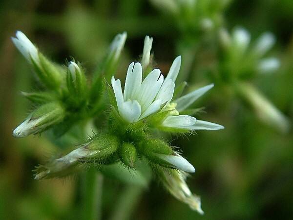 卷耳,别名:狭叶卷耳、细叶卷耳、无毛卷耳,拉丁文名:Cerastium arvense L. 石竹科、卷耳属多年生疏丛草本,高10-35厘米。茎基部匍匐,上部直立,绿色并带淡紫红色,下部被下向的毛,上部混生腺毛。叶片线状披针形或长圆状披针形,顶端急尖,基部楔形,抱茎,被疏长柔毛,叶腋具不育短枝。聚伞花序顶生,花瓣5,白色,倒卵形,蒴果长圆形,长于宿存萼1/3,顶端倾斜,10齿裂;种子肾形,褐色,略扁,具瘤状凸起。花期5-8月,果期7-9月。被称为一月女孩的幸运花。