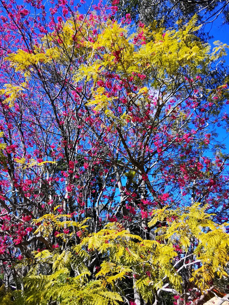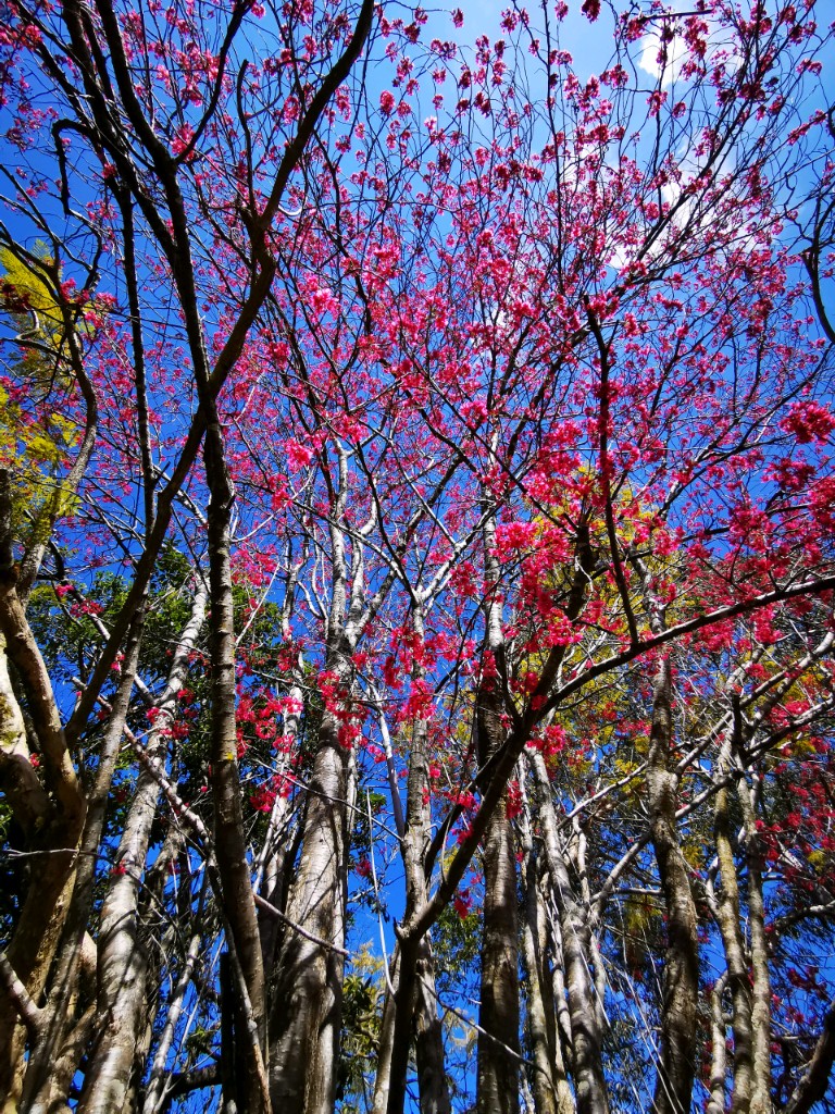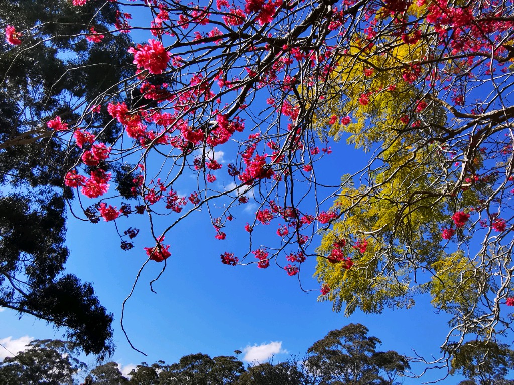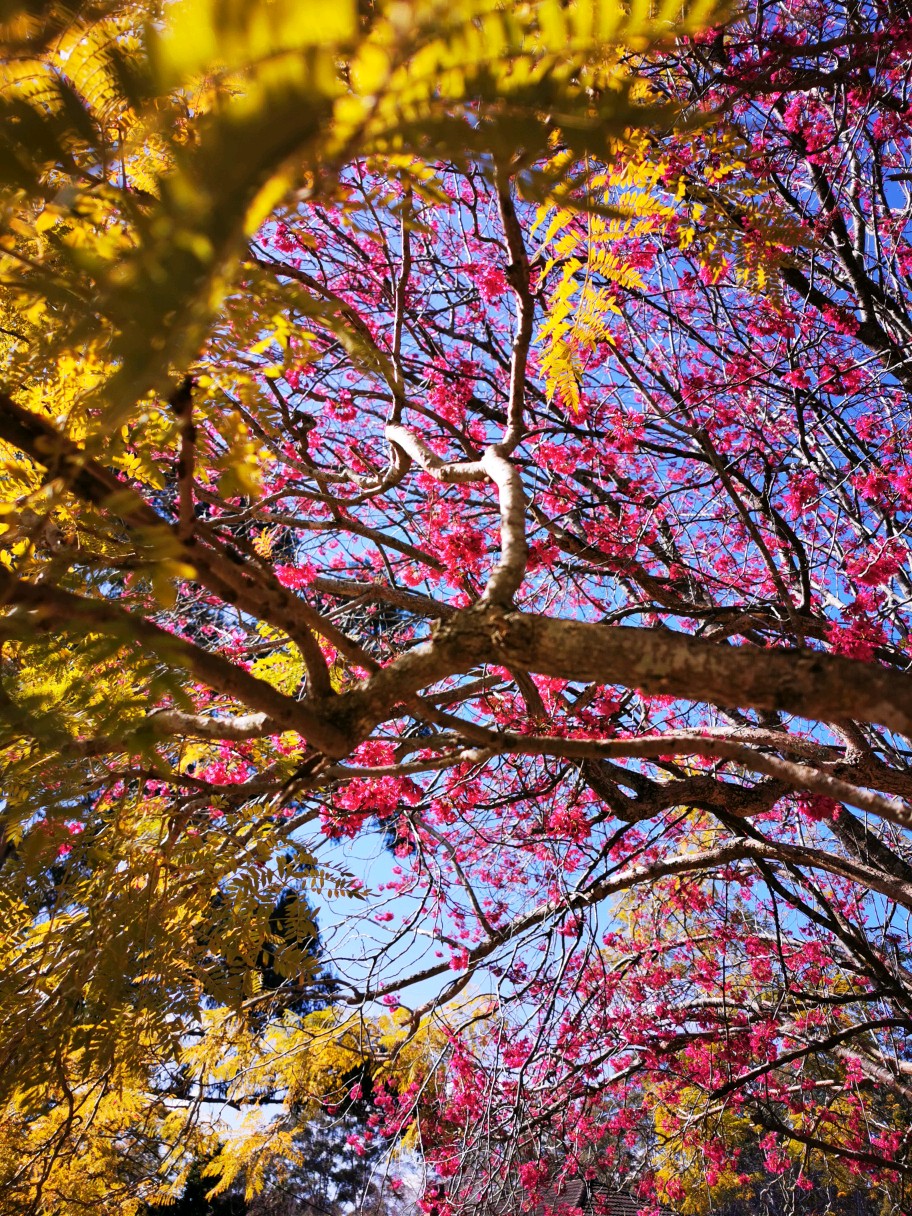 蓝花楹,还是钟花樱花?在这季节,主调当然是钟花樱花。蓝花楹当配角,鹅黄的叶子却不失亮丽。夏季,主调会是蓝色,红黄蓝绿幻变无穷