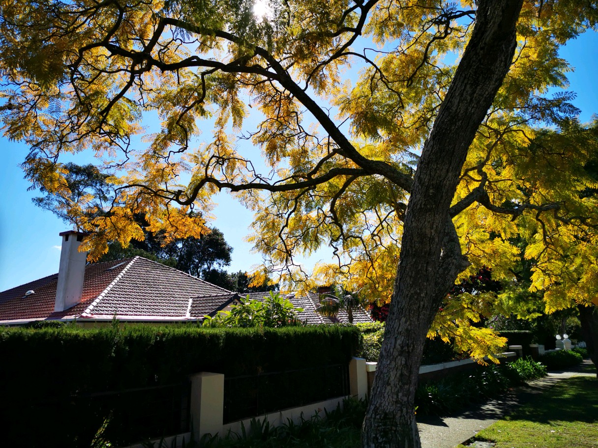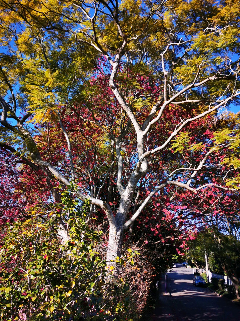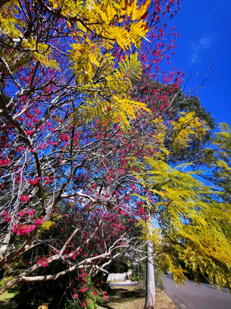 蓝花楹,还是钟花樱花?在这季节,主调当然是钟花樱花。蓝花楹当配角,鹅黄的叶子却不失亮丽。夏季,主调会是蓝色,红黄蓝绿幻变无穷