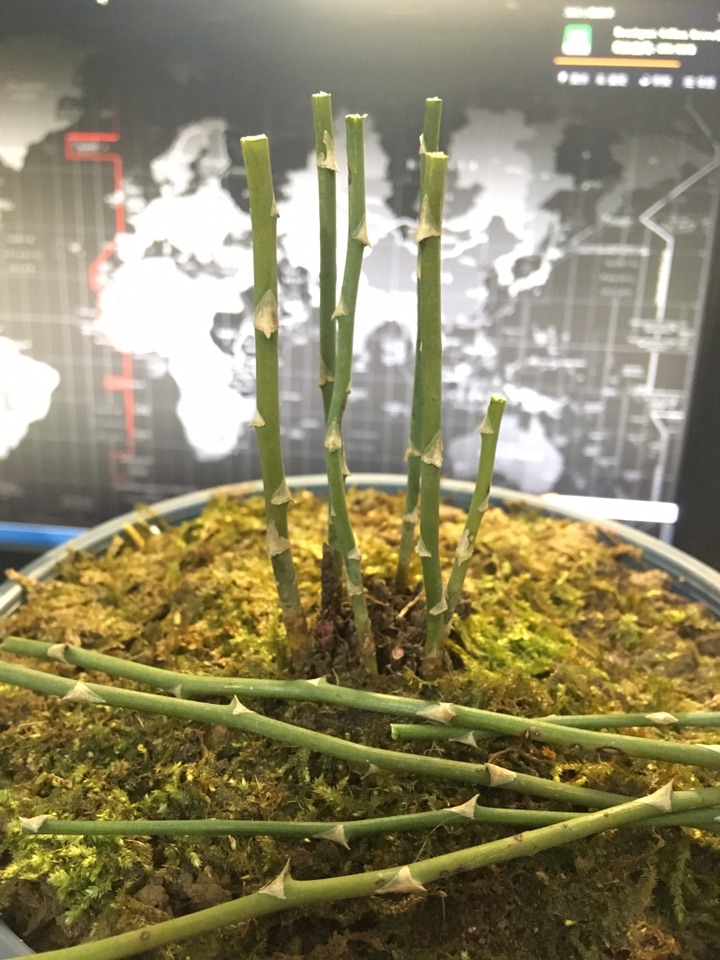 文竹,上部枝条叶子皆已干枯。换盆,剃头,期待枯木逢春。