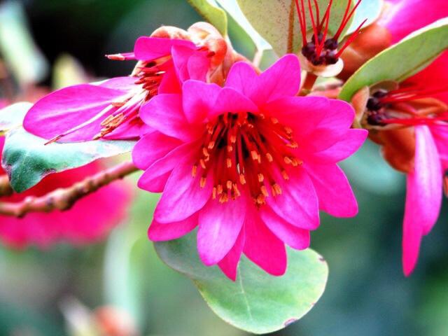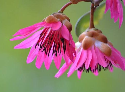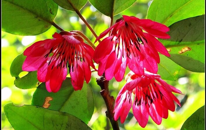 红花荷(学名:Rhodoleia championii Hook. f.):金缕梅科红花荷属常绿乔木,高可达12米,嫩枝颇粗壮,叶厚革质,卵形,光滑无毛,有三出脉,叶面呈深绿色而略带光泽,叶背呈淡绿色,被一层带蓝色的蜡粉所覆盖,网脉不显著,叶柄带红色。头状花序,常弯垂;有鳞状小苞片,总苞片卵圆形,花瓣匙形,红色;雄蕊与花瓣等长,花丝无毛;子房无毛,头状果序有卵圆形蒴果,种子扁平,黄褐色。3-4月开花。