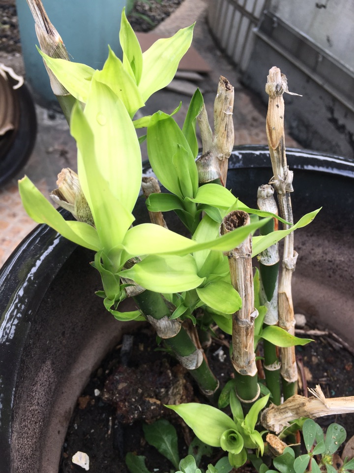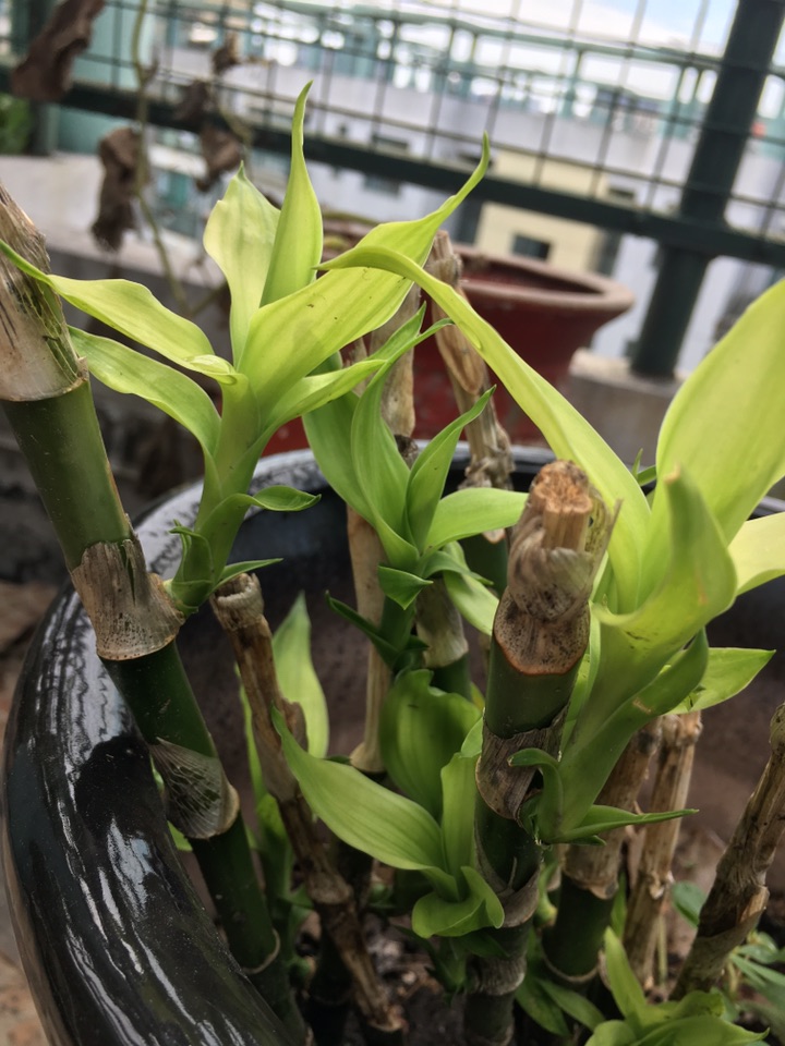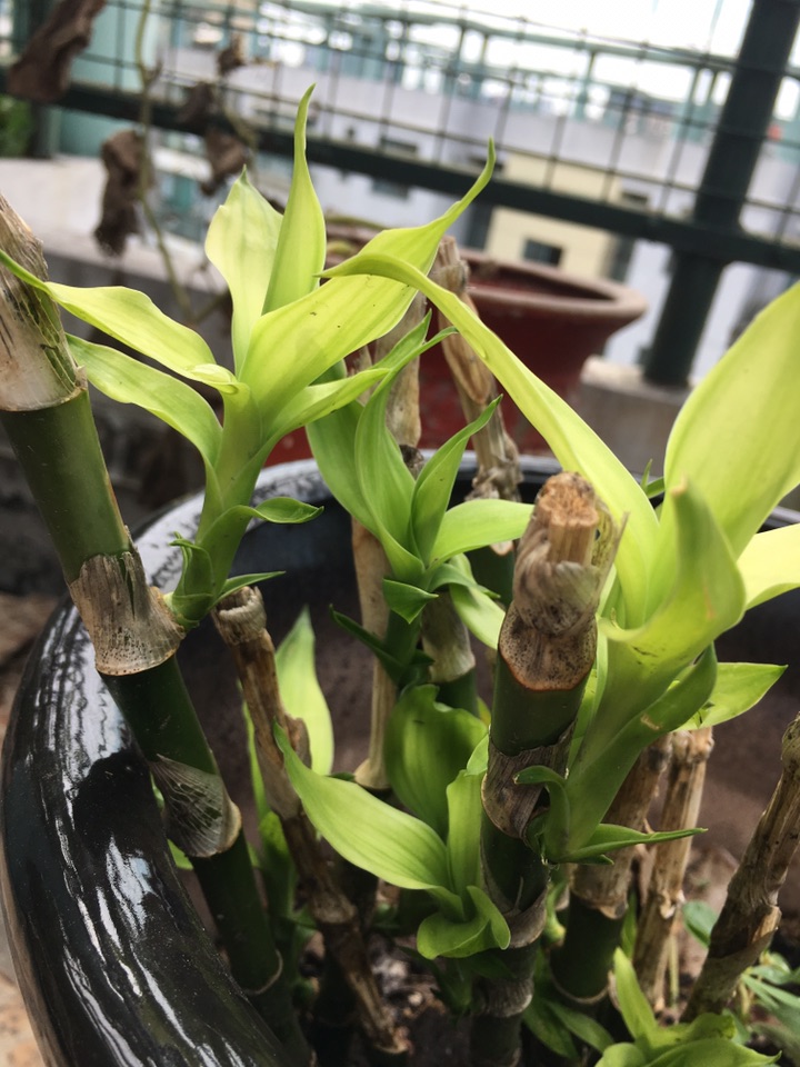 有一天在花盆里看见几个光杆,不知道是啥,以为老公随手放盆里的什么棍子。几个月过去了,光杆上长出叶片,我才发现是富贵竹。原来老公没有放弃它,原来花盆里的光杆是富贵竹。