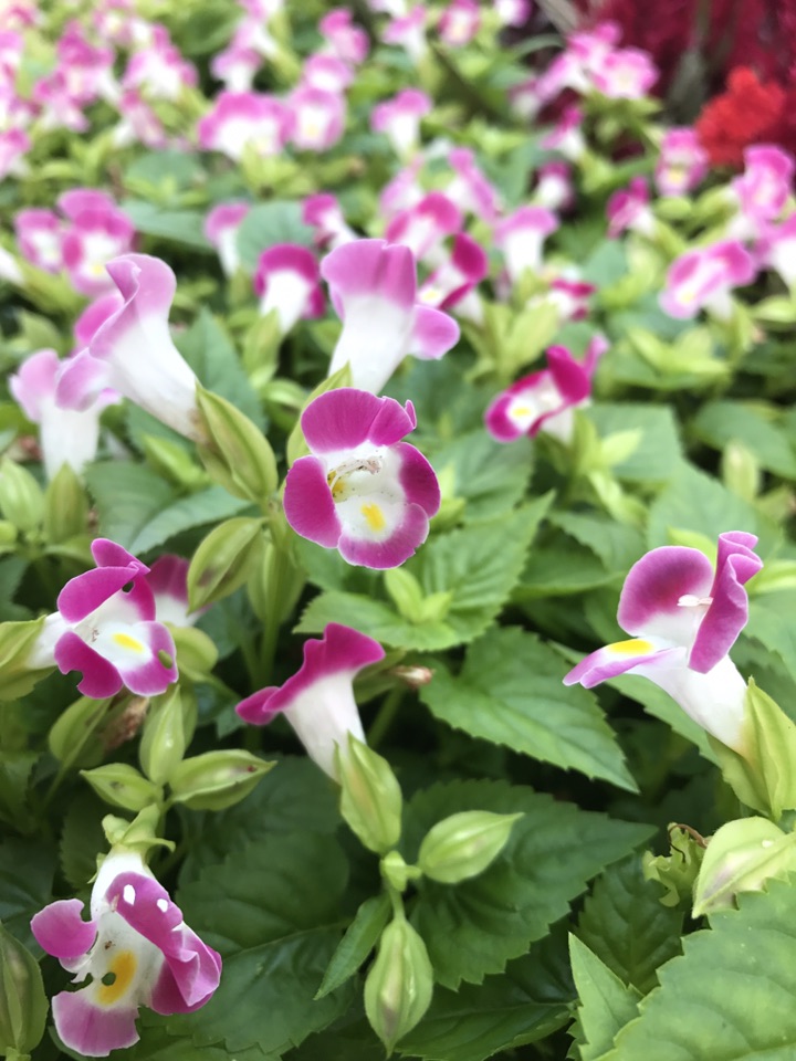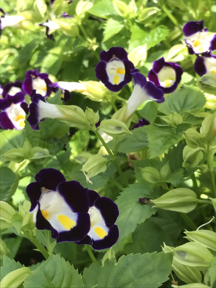 :不是喇叭花哟~ 夏堇,玄参科矮生性丛生植物,茎细小呈四棱型,花型酷似金鱼草与紫罗兰,花生于上部叶腋或顶生总状花序。花色丰富而多变,喜高温、耐炎热。原产亚洲热带、非洲林地。由于夏季开花及唇形的花朵与董菜颇为相像而得名。 夏堇又名蝴蝶草、花瓜草、花公草、蓝猪耳(整朵花蓝紫色的斑块颇大,极似猪头上的双耳,故称之蓝猪耳)、蓝月亮,是夏秋季高温地区重要的草花植物。