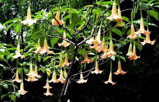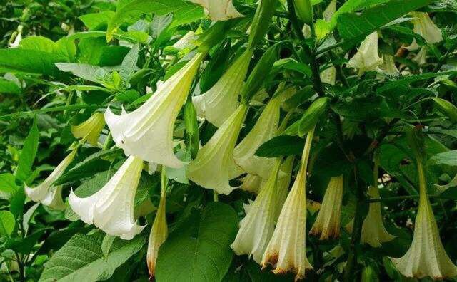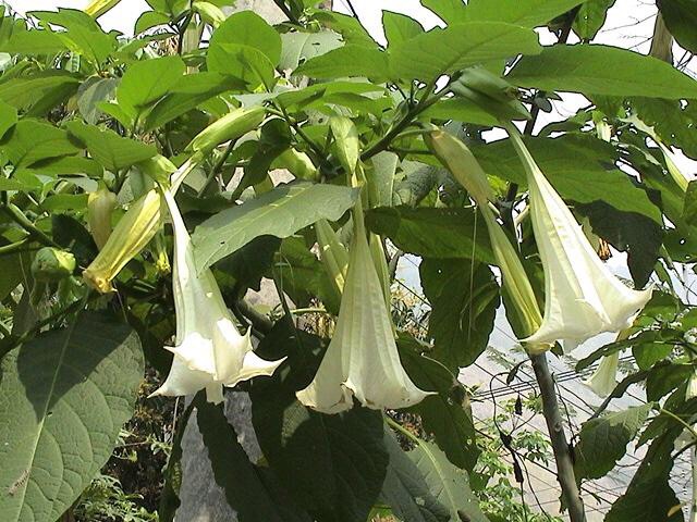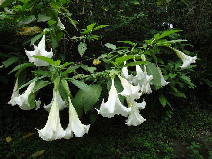 大花曼陀罗属常绿性灌木,约5公尺高,小枝灰白色;叶具长柄,叶序为互生,长椭圆形,全缘;花为单立,腋出,下垂性;在夜间开花,花萼筒形,先端5裂,花冠喇叭形,为白色,约十公分;雄蕊5枚,子房2室,果实为蒴果,圆筒状锥形。