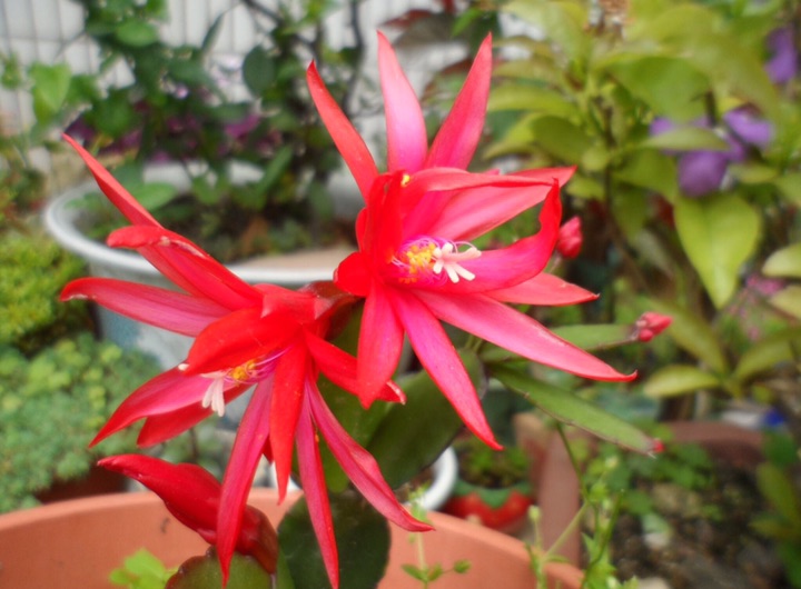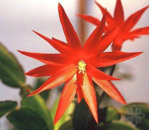 假昙花(学名:Rhipsalidopsis gaertneri (Regel) Moran )是仙人掌科、假昙花属附生类多肉植物,植株呈悬垂状,呈浅灰绿色,易木质化;分枝节状。叶片扁平,长圆形,通常为绿色,边缘深红色。边缘有小的网眼,长有几根黄色刚毛,花着生在茎节顶部,花瓣竹叶状。黄色六角形花蕊。花大,花瓣呈辐射状。偏尖细直,花色多为纯红和桃红,花朵白天开放.夜问闭合,次只再开、3-5月开花。