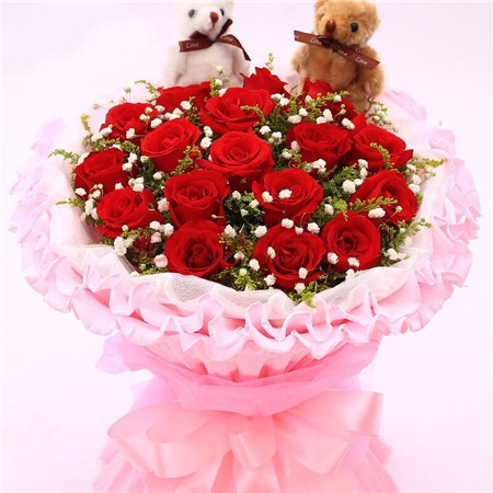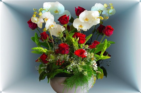 按照美学的原理,红与绿乃是强烈的对比色,尤其是红色更是具有刺激性的色调,而白色则为过度色,属可调和性的色调。使作品变得更有层次和深度,充分显示出立体感,那更能起到强烈的衬托作用,使主体和附体表现得十分融洽和谐,气韵浑然,花与满天星的搭配达到实中有虚,虚中更实的深沉寓意。