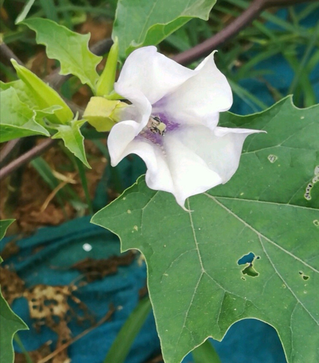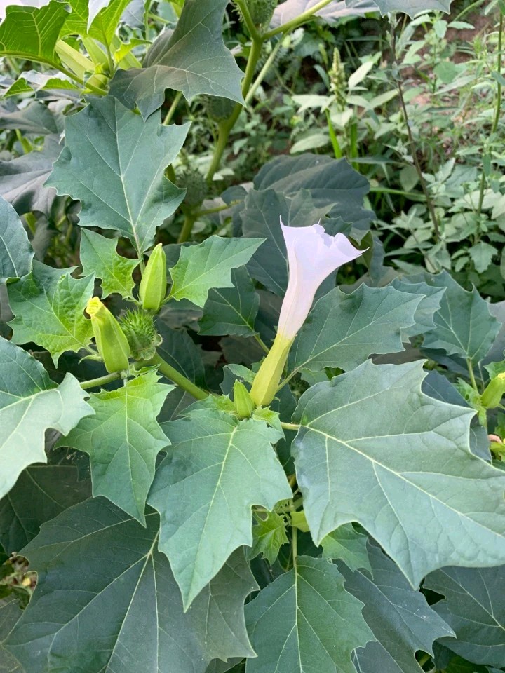 曼陀罗花又叫洋金花、大喇叭花、山茄子、夕颜、醉心花、狗核桃、醉仙桃等,果实名为:狗核桃、毛苹果。为茄科曼陀罗属、一年生直立草本植物,原产印度,现广泛分布全球,我国各地均有野生或栽培,主产在华南地区,以广西最多。花期6-8月[1],果期6-10月,喜温暖、向阳及排水良好的砂质壤土。多野生在田间、沟旁、道边、河岸、山坡等地方,主要危害棉花、豆类、薯类、蔬菜等,有剧毒。