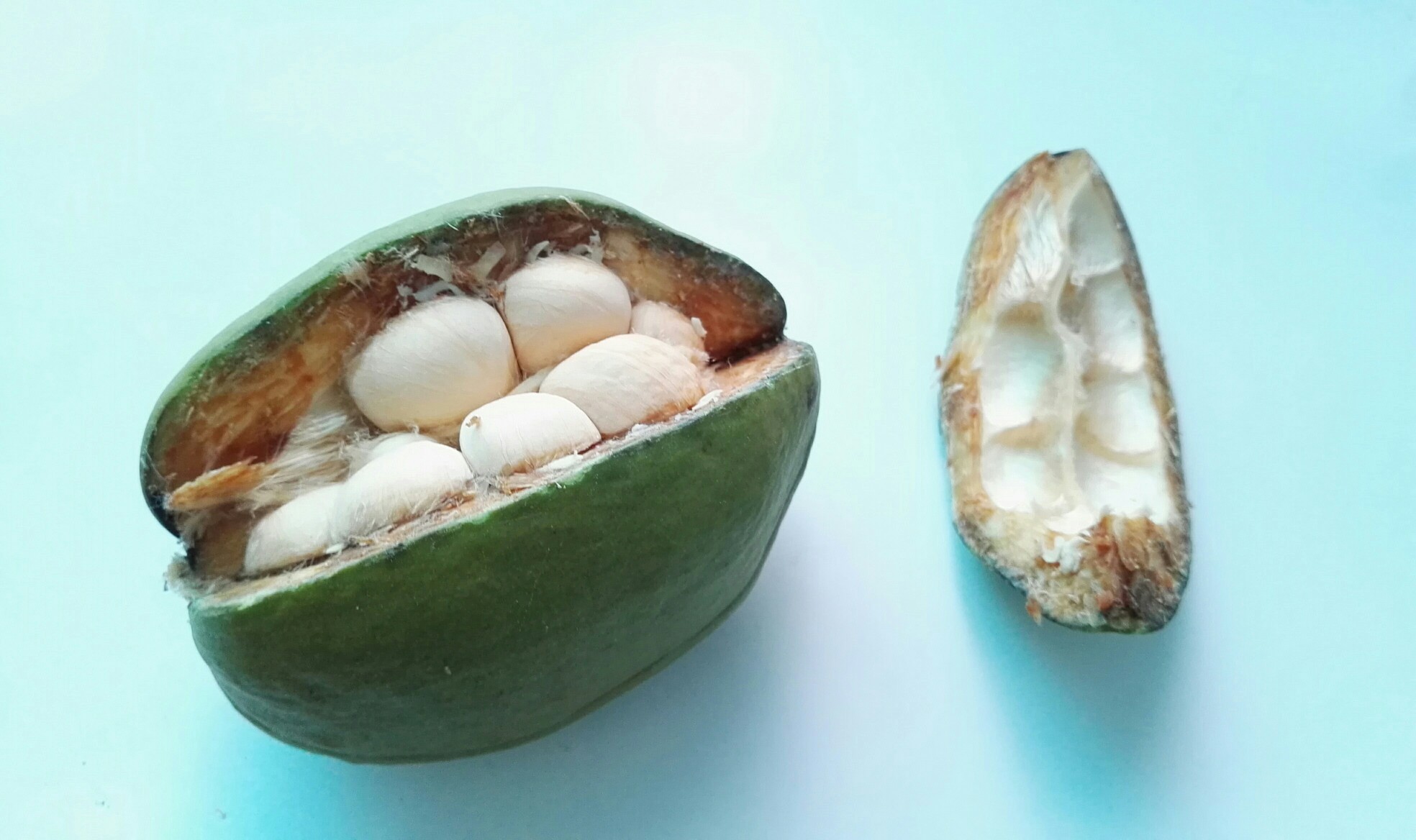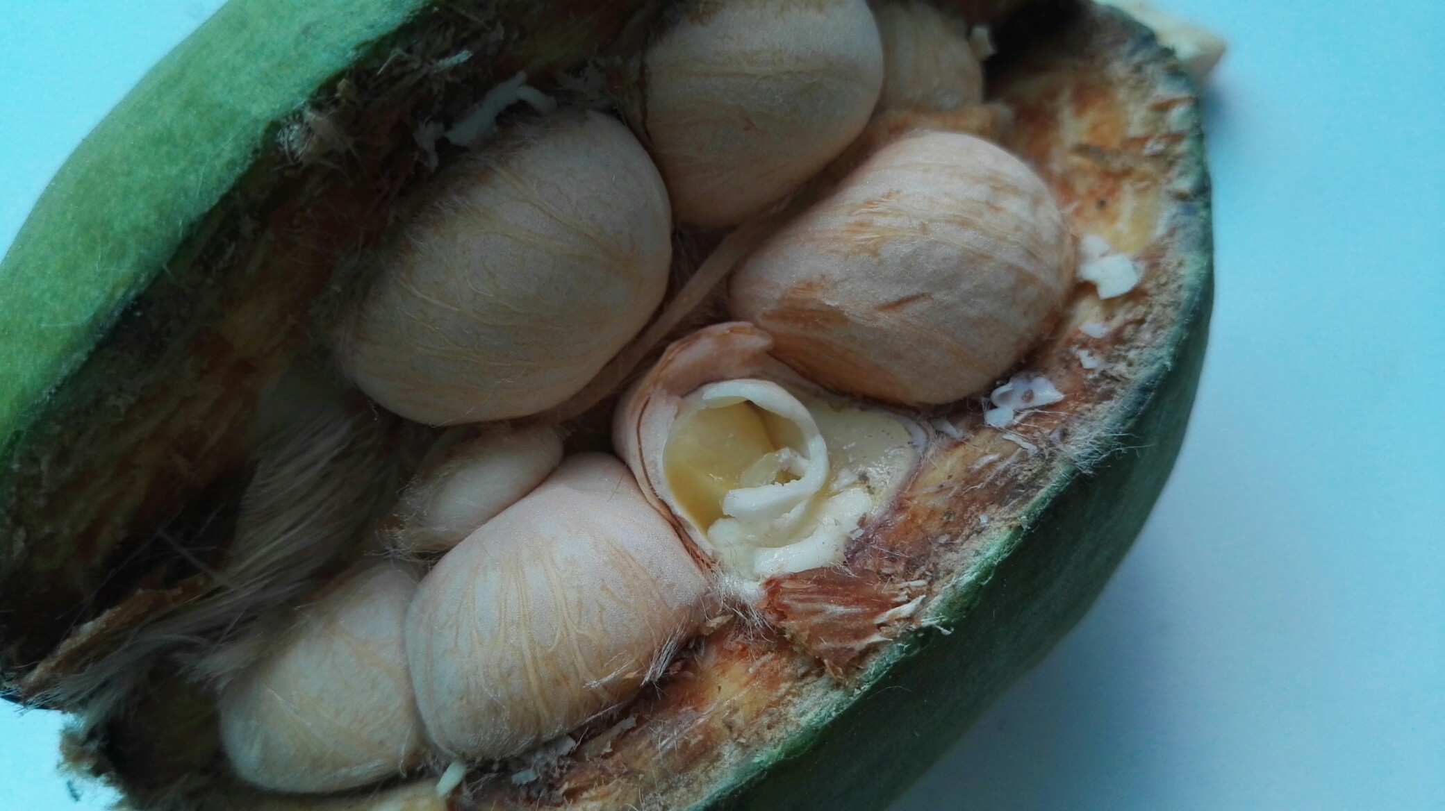 蒴果近梨形,果皮厚,木质,几黄褐色,外面无毛,内面密被长绵毛,开裂,每室种子多数。种子大,不规则的梯状楔形,表皮暗褐色,有白色螺纹,内含多胚。[引自百度百科瓜栗词条]