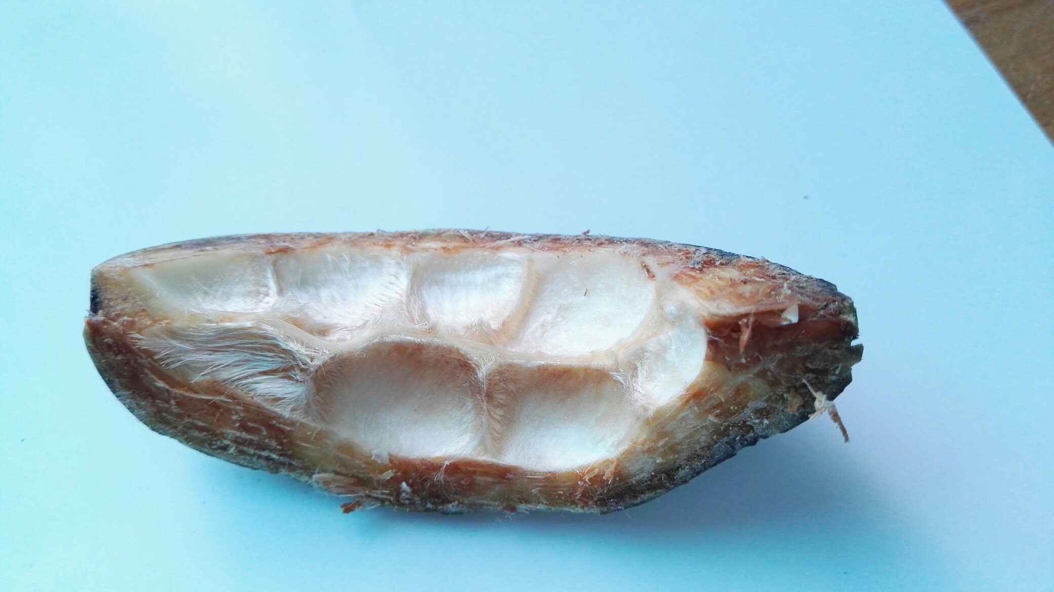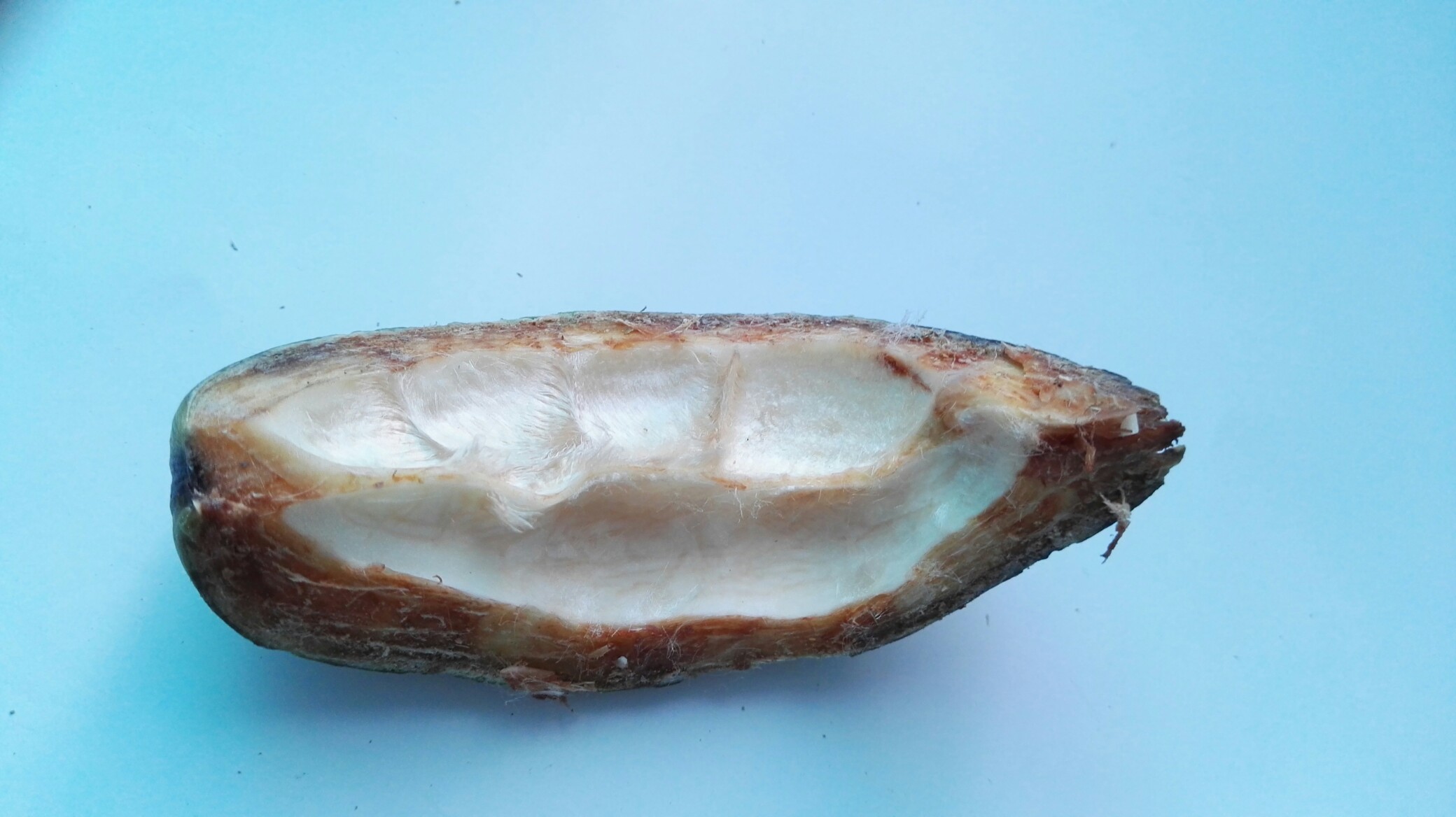 中间那一长条“隔断”倒是很坚硬的,不是棉毛。透过左侧那个小孔,我们可以看到下边儿的种子。