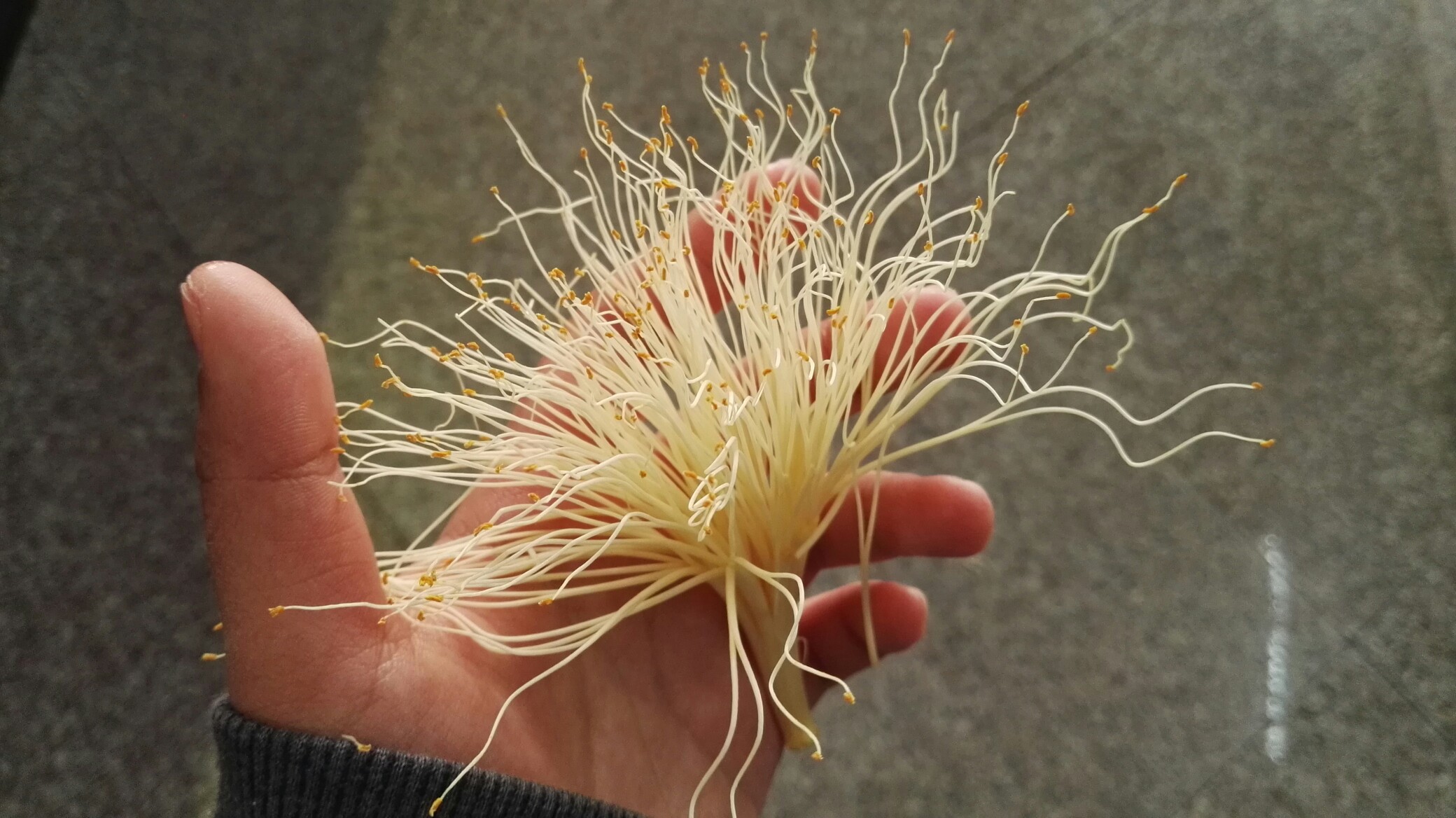 刚好掉到我面前的瓜栗花,从高高的树上掉下来,花瓣散了掉了,只剩一把雄蕊了。暗黄色的花药,花丝倒是风一吹就折。