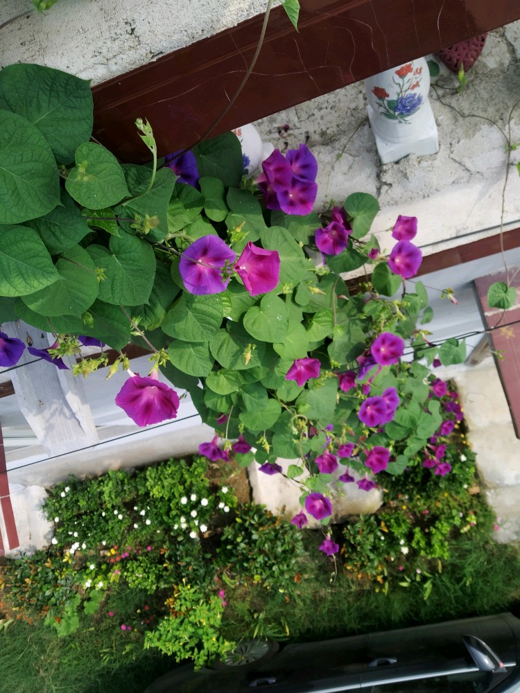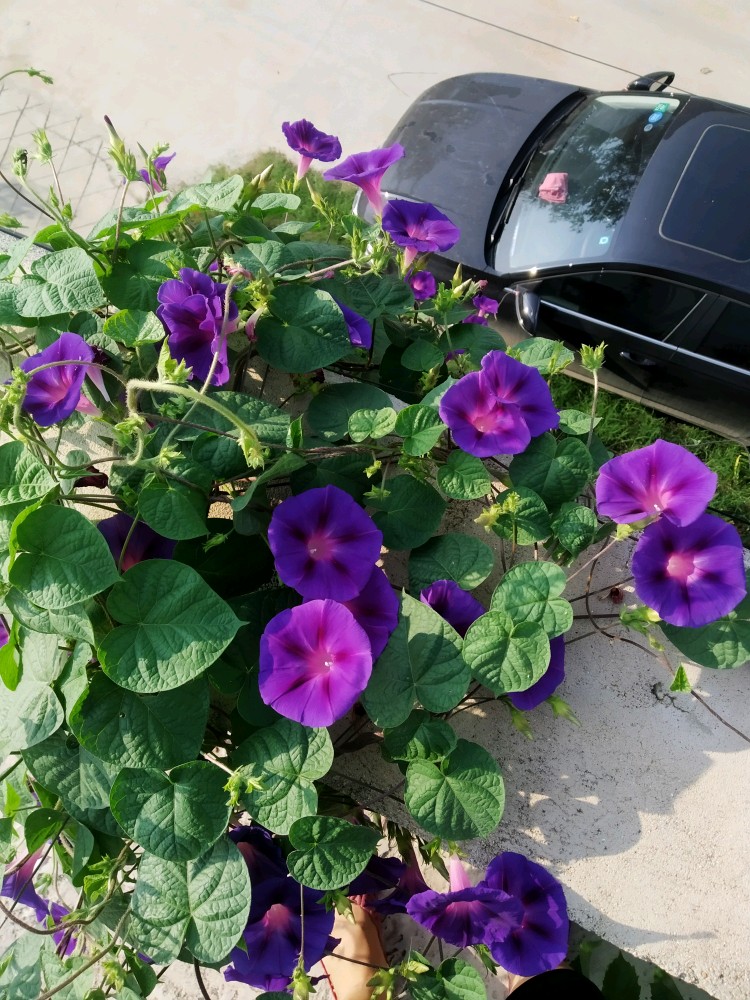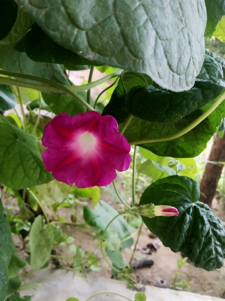 看着好笑,我去年找的红喇叭花种子,今年叶子肥的像南瓜叶,像长傻了似的,藤蔓也很粗,就是没有门口的那颗紫的旺,花多。不知是不是因为,它前面那颗柿子树遮阴的原因是不是?它的母本我去年看到,开的非常好看,正宗的粉红色,花朵也很大,像小碗儿,