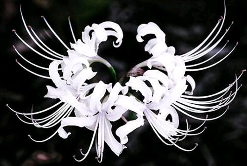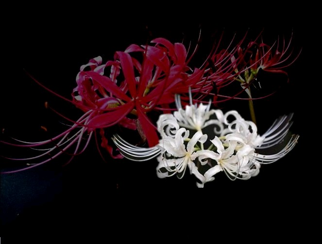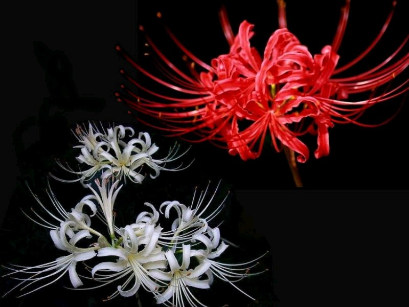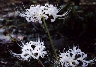 民间称这两种花为彼岸花,传说中自愿投入地狱的花朵,被众魔遣回,但仍徘徊于黄泉路上,众魔不忍,遂同意让她开在此路上,给离开人界的冤魂们一个指引和安慰。雪白色与血红色的彼岸花共同代表死亡。