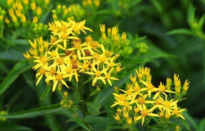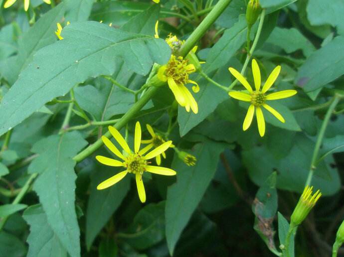 千里光(学名:Senecio scandens Buch.-Ham. ex D. Don)是菊科,千里光属多年生攀援草本植物,根状茎木质,粗,多分枝,老时变木质,皮淡色。叶片卵状披针形至长三角形,顶端渐尖,基部宽楔形,截形,戟形或稀心形,羽状脉,叶脉明显;头状花序有舌状花,多数,花序梗长,具苞片,小苞片线状钻形。舌状花舌片黄色,长圆形,管状花多数;花冠黄色,裂片卵状长圆形,尖,花药颈部伸长,瘦果圆柱形,冠毛白色。