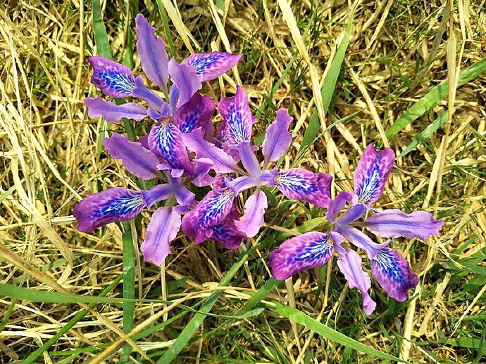 野鸢尾(学名:Iris dichotoma Pall.):多年生草本。根状茎为不规则的块状,棕褐色或黑褐色;须根发达,粗而长,黄白色,分枝少。叶基生或在花茎基部互生,两面灰绿色,剑形。花茎实心,高40-60厘米,上部二歧状分枝,分枝处生有披针形的茎生叶,下部有1-2枚抱茎的茎生叶,花序生于分枝顶端;苞片4-5枚,膜质,绿色,边缘白色,披针形,内包含有3-4朵花;花蓝紫色或浅蓝色,有棕褐色的斑纹,外花被裂片宽倒披针形,上部向外反折,内花被裂片狭倒卵形,顶端微凹。蒴果圆柱形或略弯曲,果皮黄绿色,革质;种子暗褐色,椭圆形,有小翅。花期7-8月,果期8-9月。