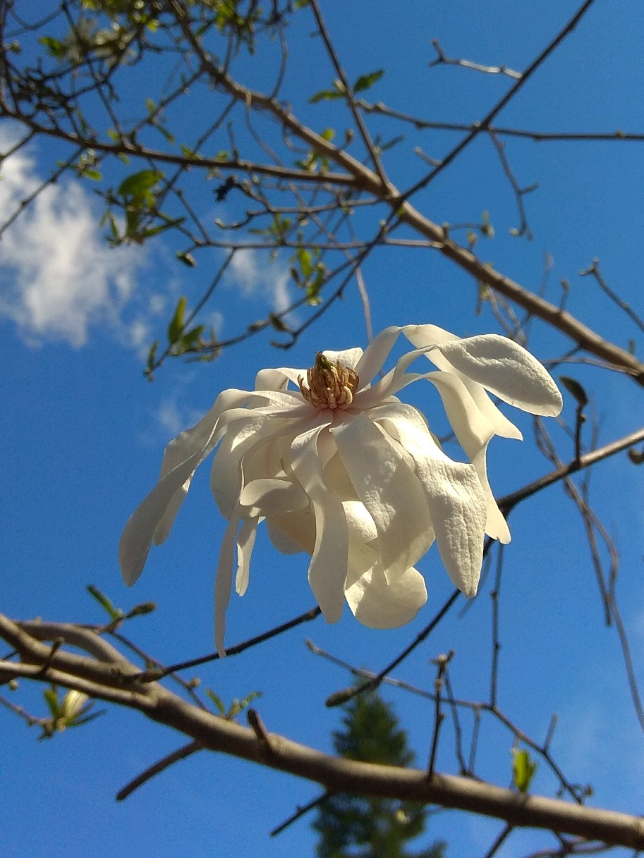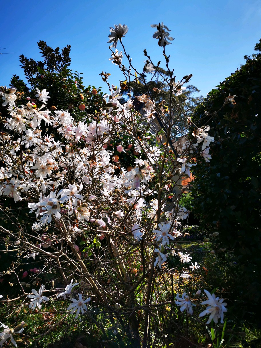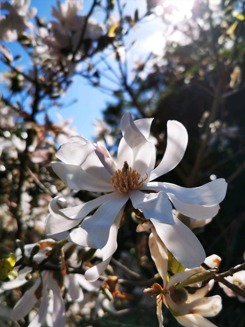 星花玉兰株型较小,花开满树时就会略显拥挤与零乱了。细看之下,花其实极美,花瓣修长更显优雅。微风一吹,仿佛听到阵阵娇笑