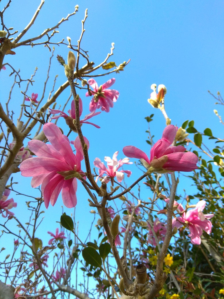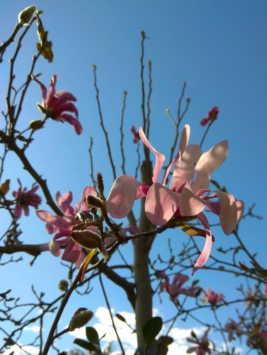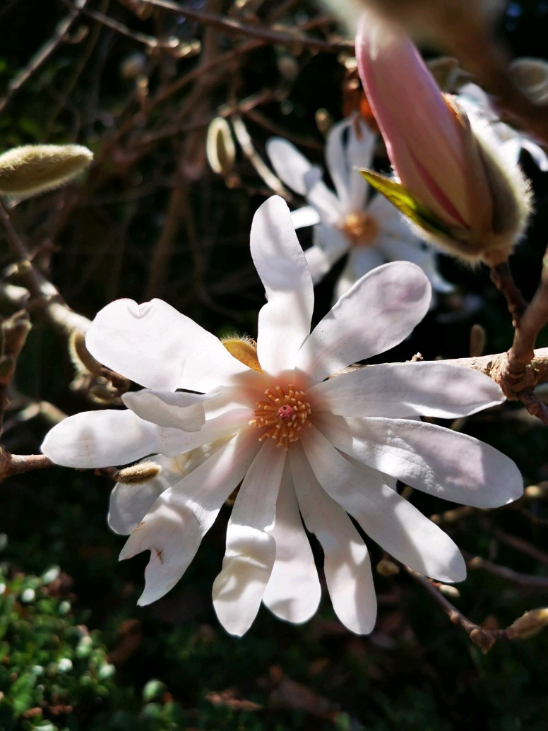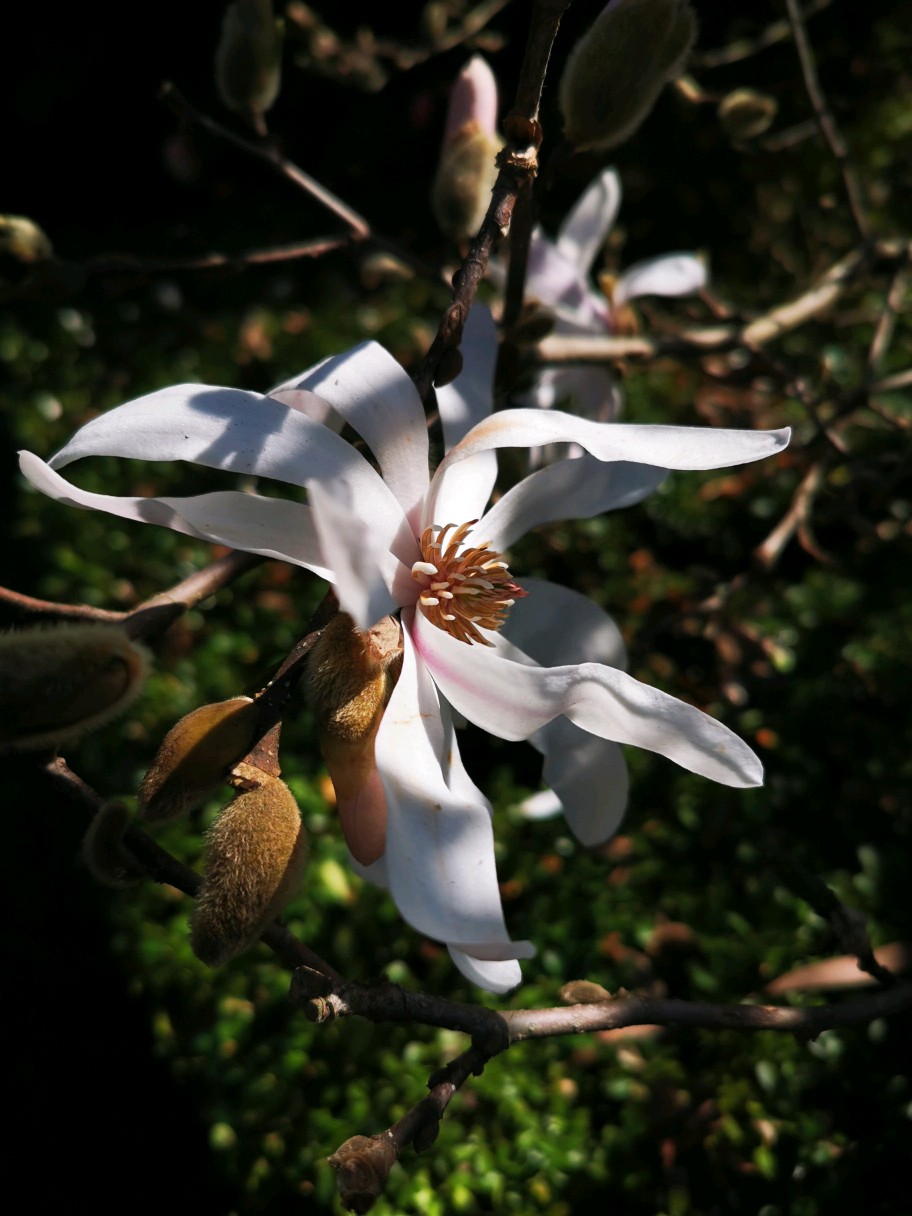星花玉兰株型较小,花开满树时就会略显拥挤与零乱了。细看之下,花其实极美,花瓣修长更显优雅。微风一吹,仿佛听到阵阵娇笑