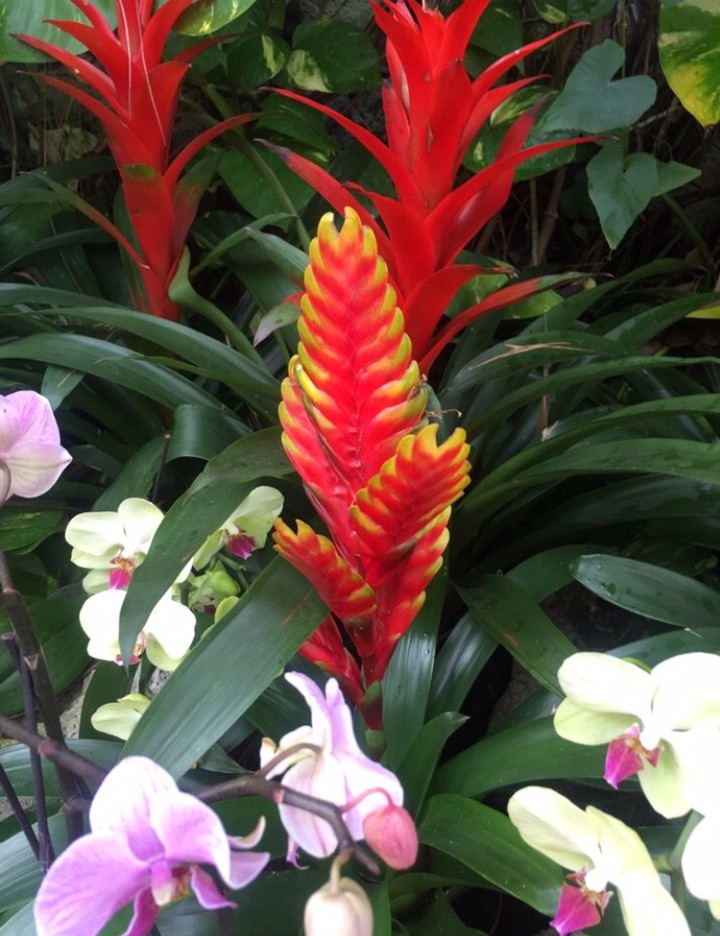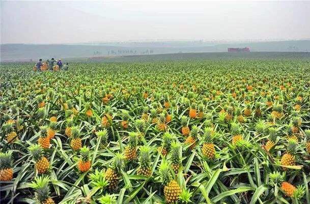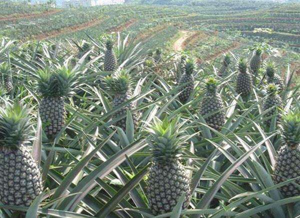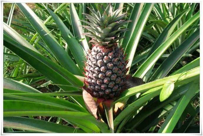 凤梨学名:Ananas comosus (Linn.) Merr茎短。叶多数,莲座式排列,剑形,顶端渐尖,全缘或有锐齿,腹面绿色,背面粉绿色,边缘和顶端常带褐红色,生于花序顶部的叶变小,常呈红色。花序于叶丛中抽出,状如松球;苞片基部绿色,上半部淡红色,三角状卵形;萼片宽卵形,肉质,顶端带红色;花瓣长椭圆形,端尖,上部紫红色,下部白色。聚花果肉质。花期夏季至冬季[