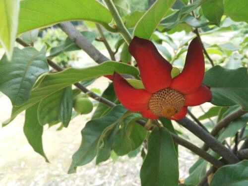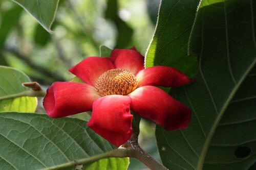 花单朵,与叶对生,紫红色或深红色,大形,直径达9厘米;花梗短,长约5毫米;苞片2,大形,卵圆形,长3厘米,宽2.5厘米;萼片膜质,宽卵圆形,长2-2.5厘米,宽2.5-3.5厘米,顶端钝或急尖;花瓣卵圆形或长圆状卵圆形,长和宽约为萼片的2-3倍,内轮比外轮略为大些,两面被微毛;雄蕊长圆形或线形,长7毫米,药隔顶端截形,无毛;心皮长圆形或线形,长8毫米,柱头顶端2裂而内卷,每心皮有胚珠30颗以上,2排。