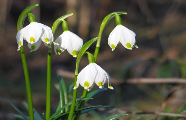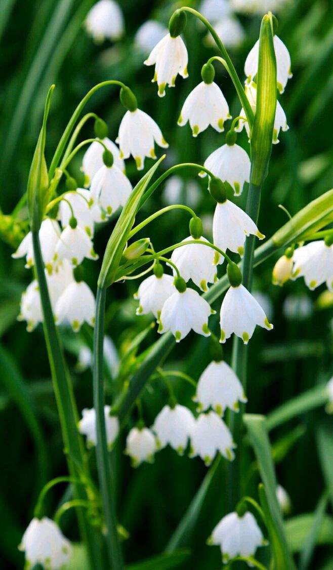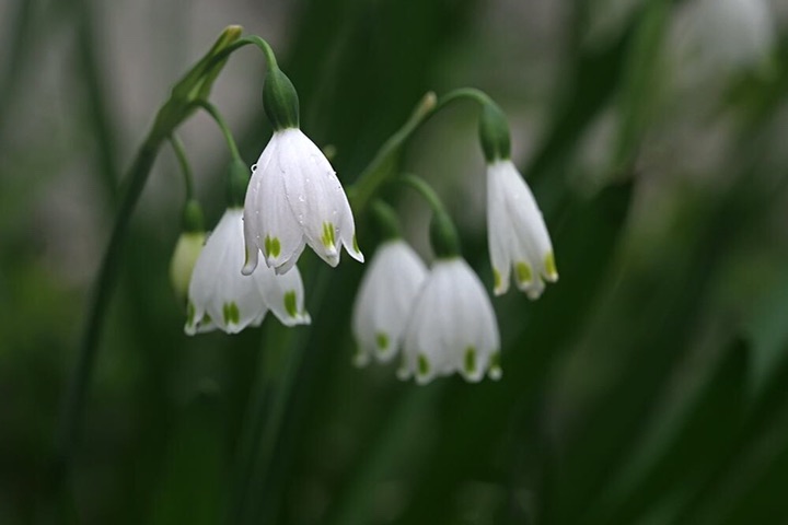 夏雪片莲是石蒜科雪片莲属,多年生球根植物。植株高24~36cm。叶深绿、长剑形。花茎细长,顶端白色花冠下垂,呈灯罩形,各花瓣的端尖都带有绿色的斑纹。花期为晚春至早夏。喜欢全日照。此种植物花形十分美丽动人,是喜欢极湿条件的球根花卉之一。虽然是沼泽园中常见的一种植物,但在野外多生于溪流边沿。