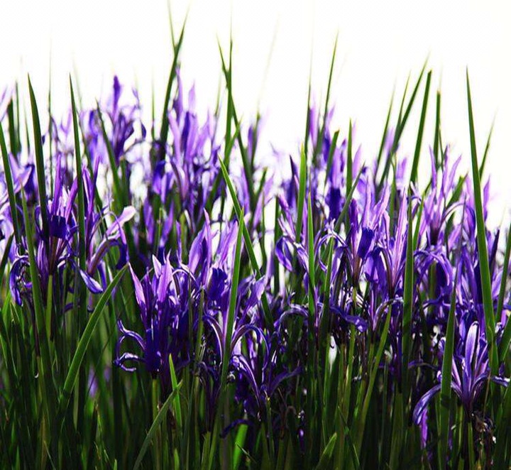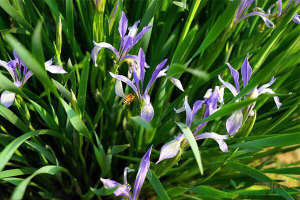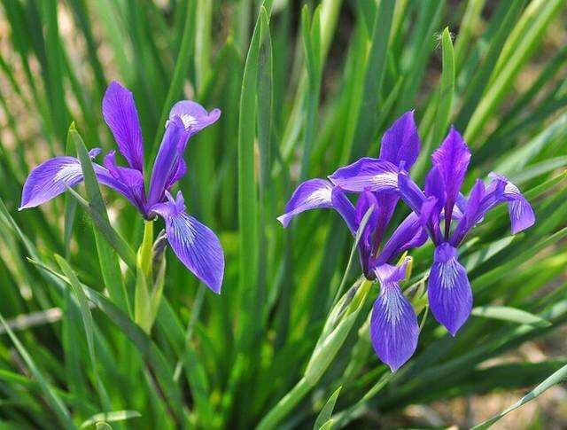 叶基生,宽线形,高度可达到1250px,宽度0.4~25px,灰绿色,花茎高约250px,2~4朵花,花为浅蓝色、蓝色或蓝紫色,花被上有较深色的条纹;蒴果长椭圆状柱形,有6条明显的肋,顶端有短喙;长4~150px,种子为不规则的多面体,棕褐色,略有光泽,种子9月份成熟。花期5-6月,果期 6-9月。