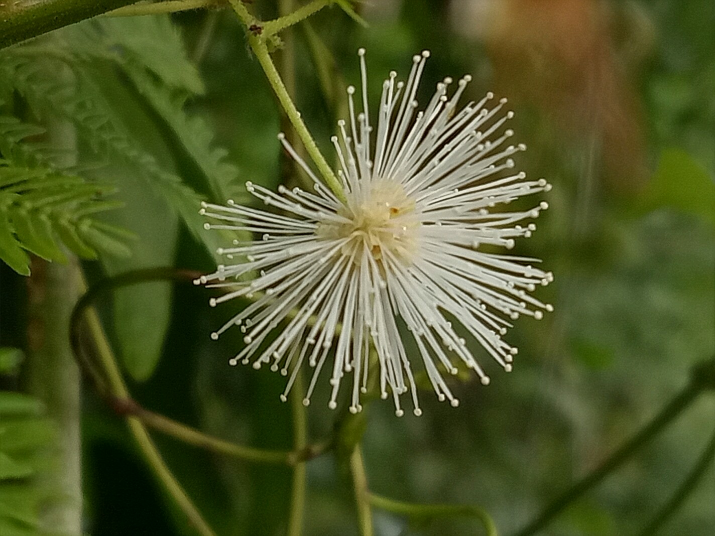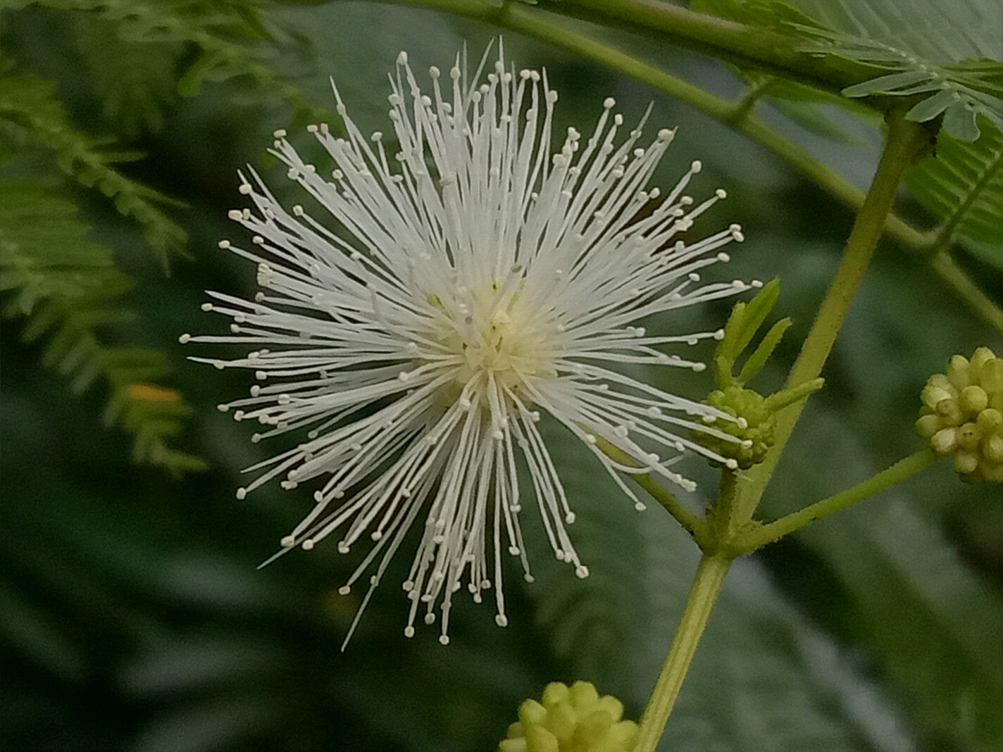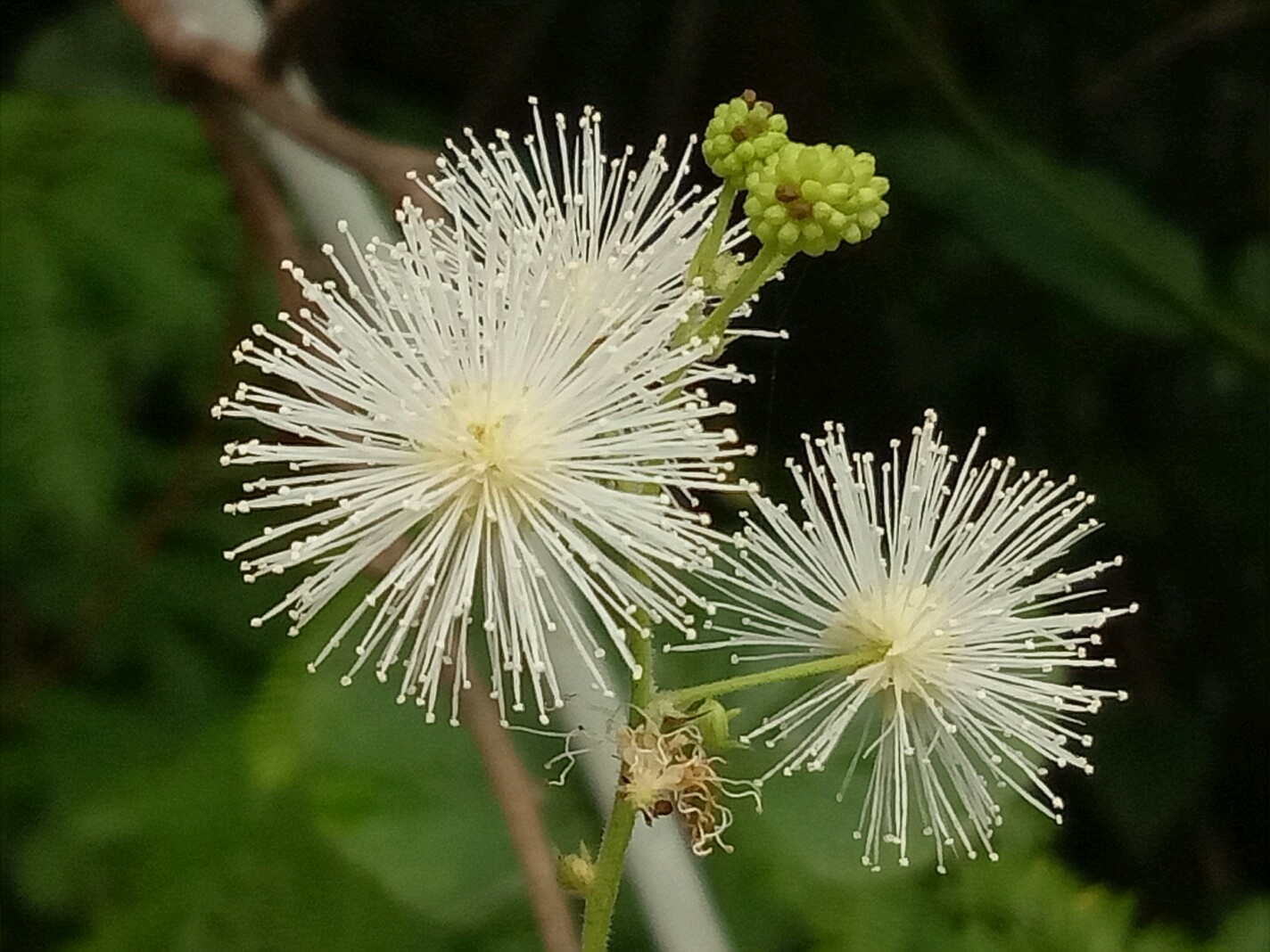 光荚含羞草的花白色,高大且不带刺。含羞草则花色粉红,枝条匍匐不高大且带刺。