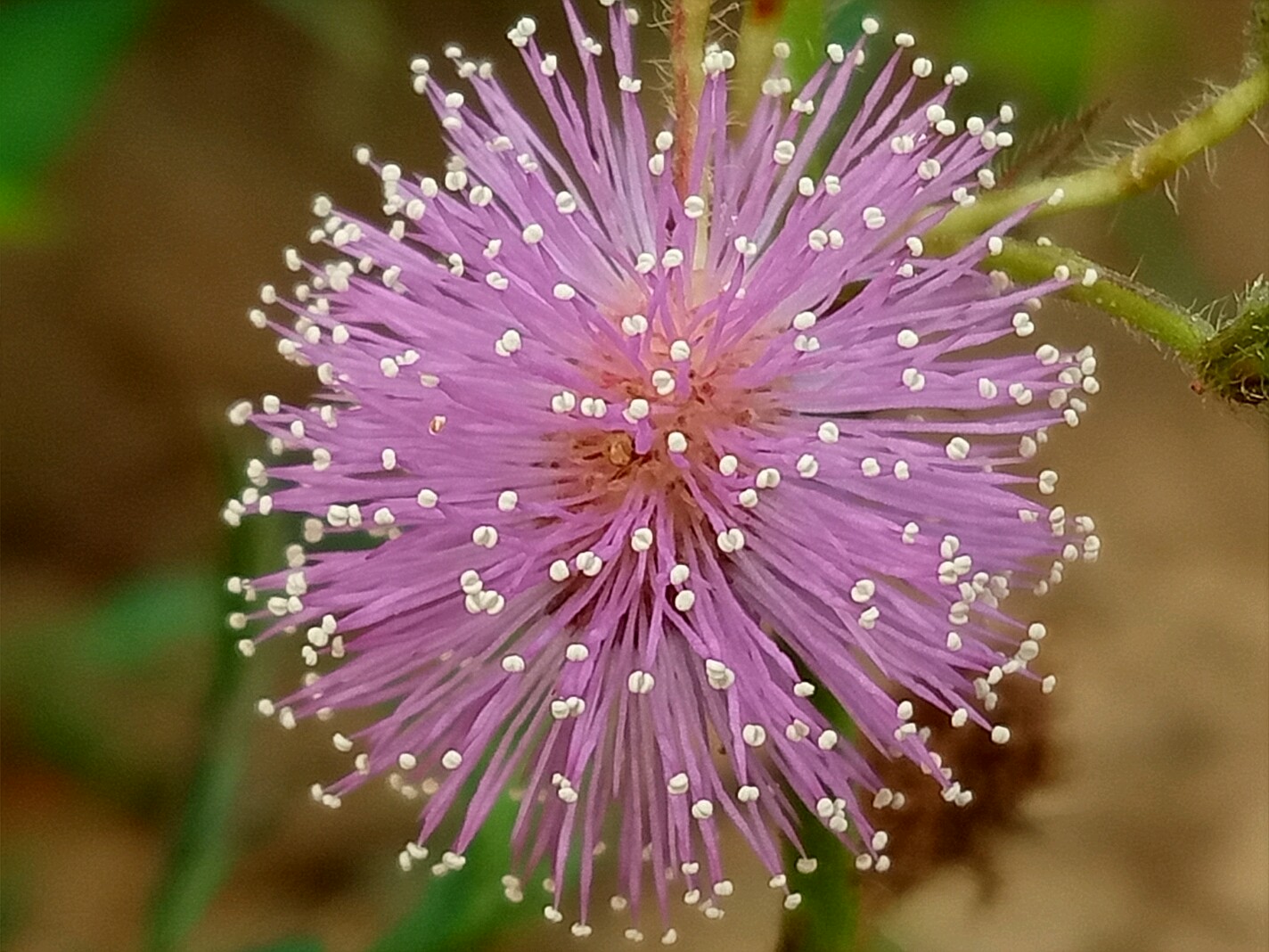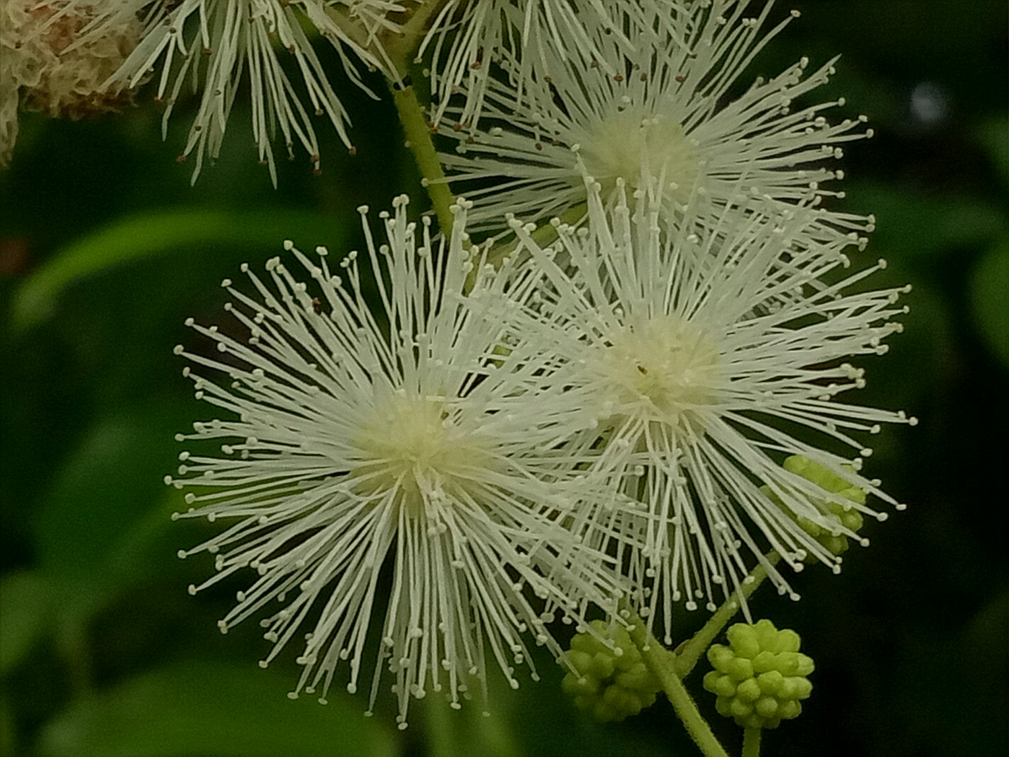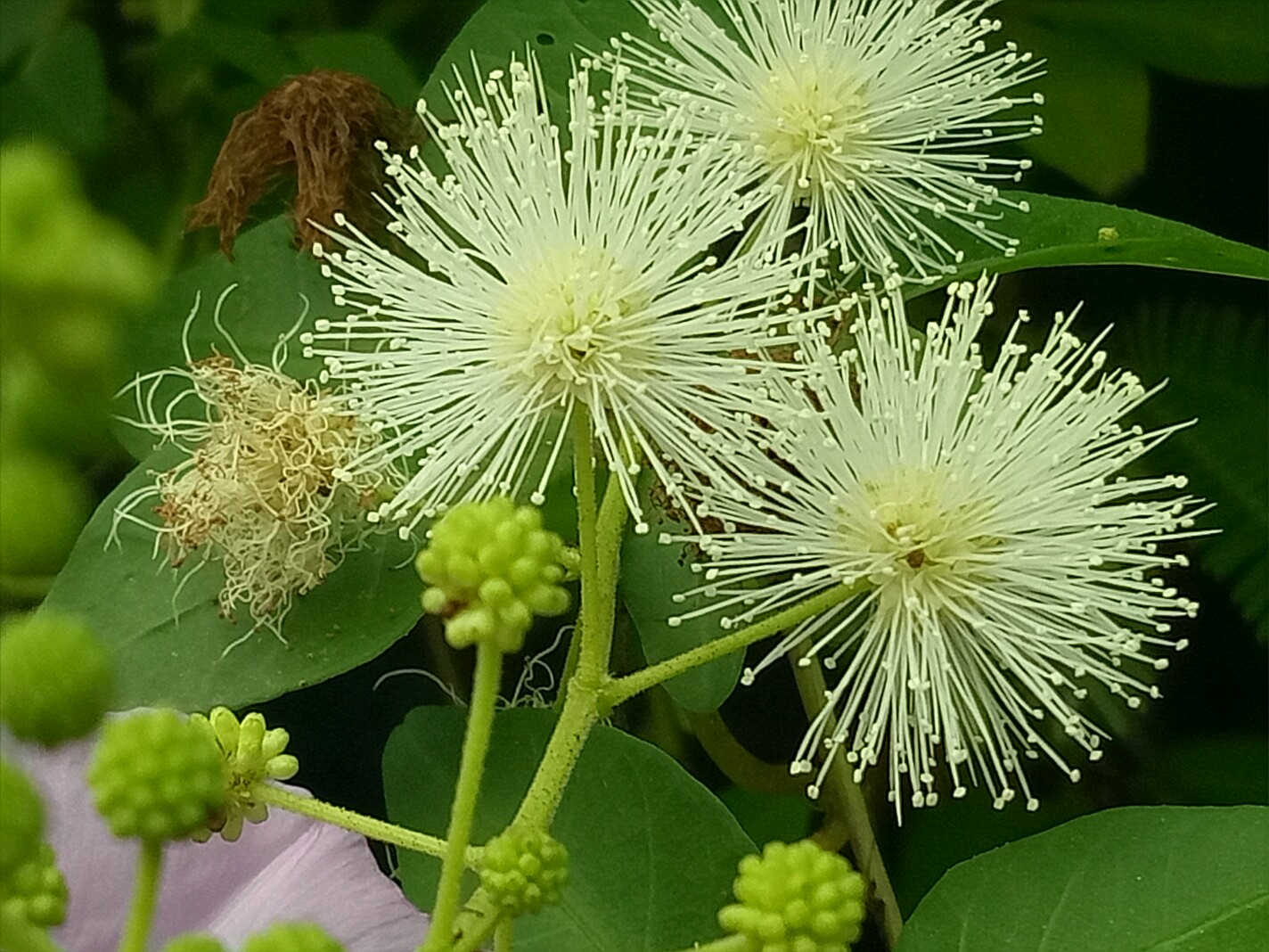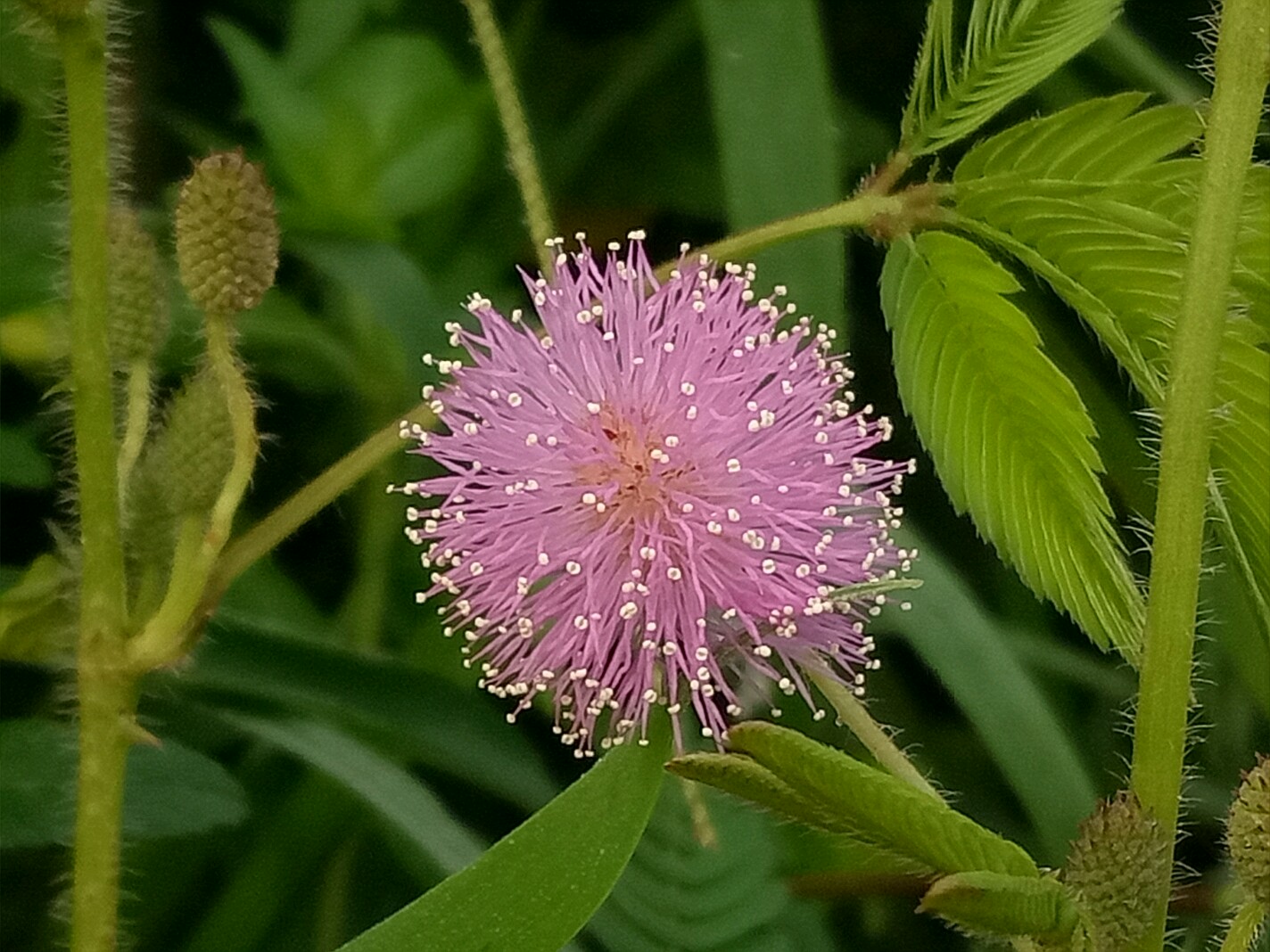 光荚含羞草的花白色,高大且不带刺。含羞草则花色粉红,枝条匍匐不高大且带刺。
