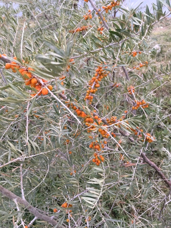 .....这是沙棘...我们叫酸溜溜...其实成熟后很甜的...只是儿时的我们等不到它完熟...早早下手...有时候超市看到沙棘汁饮料,也买...一种回忆吧.