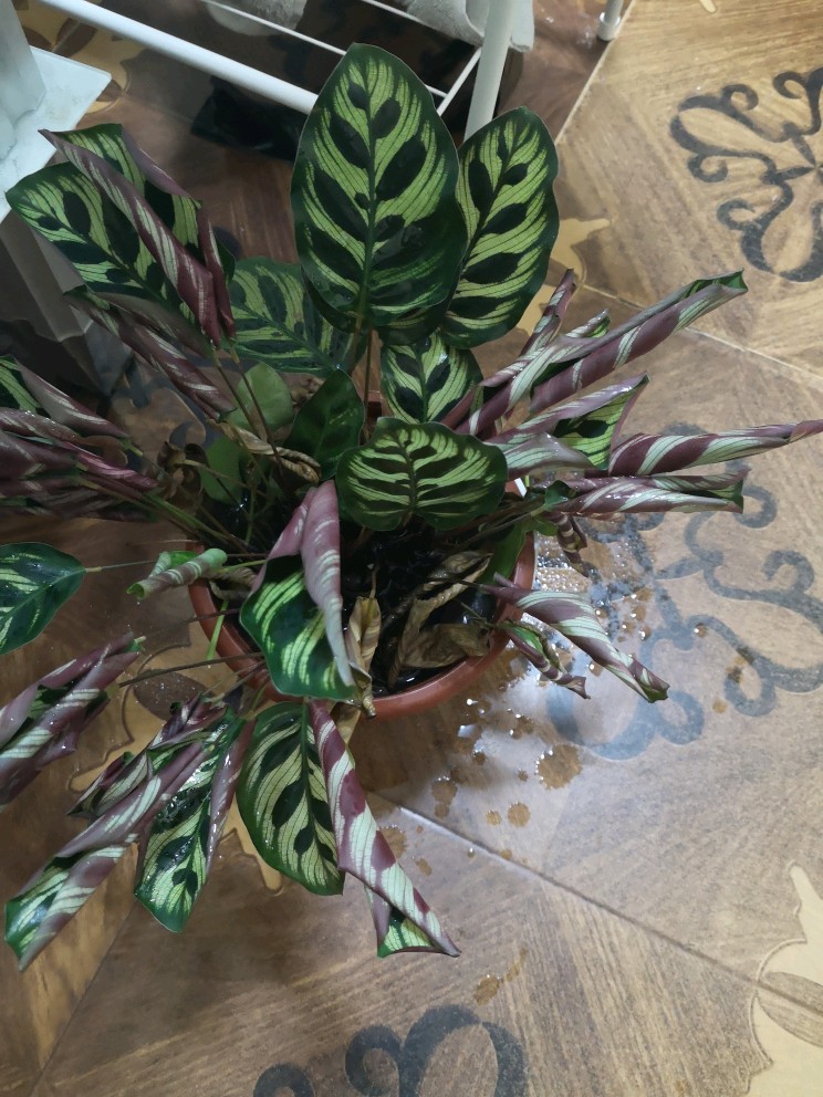 卖花的姐姐说,这是水少了。所以这两天早晚我都猛灌水。但是孔雀竹芋的情况不见好转,心疼啊,曾经它叶片很多,很繁盛。如今。是我没照顾好,想要让它重新容光焕发!!