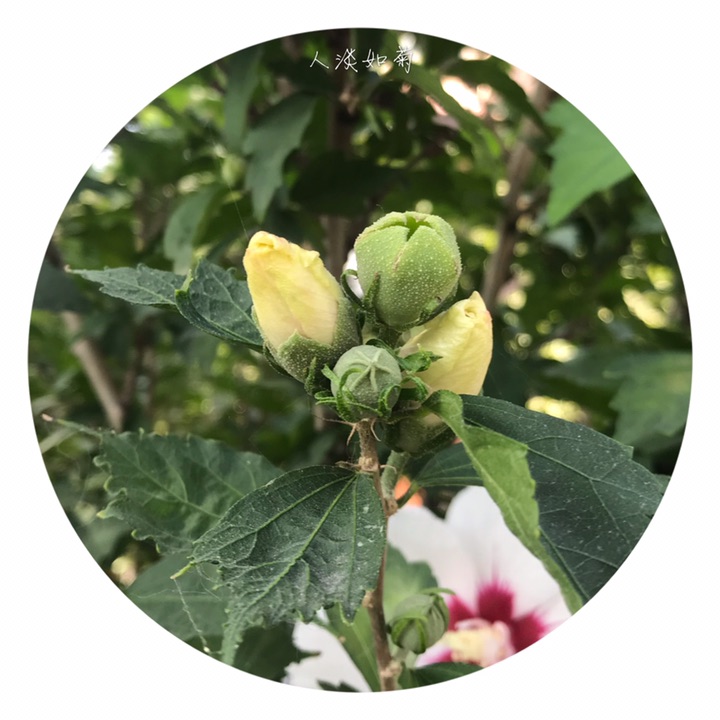 木槿(原变种):落叶灌木,高3-4米,小枝密被黄色星状绒毛。叶菱形至三角状卵形,长3-10厘米,宽2-4厘米,具深浅不同的3裂或不裂,先端钝,基部楔形,边缘具不整齐齿缺,下面沿叶脉微被毛或近无毛;叶柄长5-25毫米,上面被星状柔毛;托叶线形,长约6毫米,疏被柔毛。花单生于枝端叶腋间,花梗长4-14毫米,被星状短绒毛;小苞片6-8,线形,长6-15毫米,宽1-2毫米,密被星状疏绒毛;花萼钟形,长14-20毫米,密被星状短绒毛,裂片5,三角形;花钟形,淡紫色,直径5-6厘米,花瓣倒卵形,长3.5-4.5厘米,外面疏被纤毛和星状长柔毛;雄蕊柱长约3厘米;花柱枝无毛。蒴果卵圆形,直径约12毫米,密被黄色星状绒毛;种子肾形,背部被黄白色长柔毛。花期7-10月。