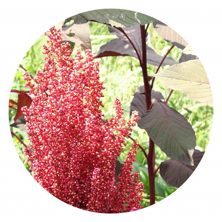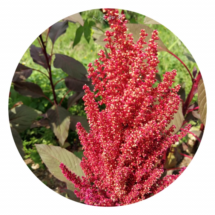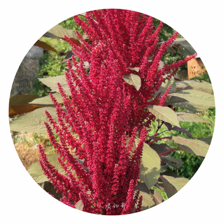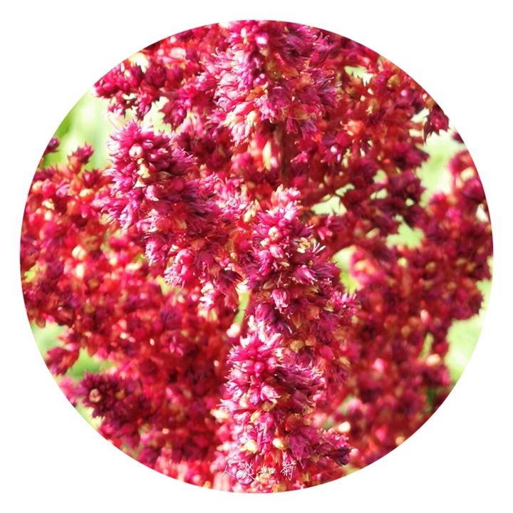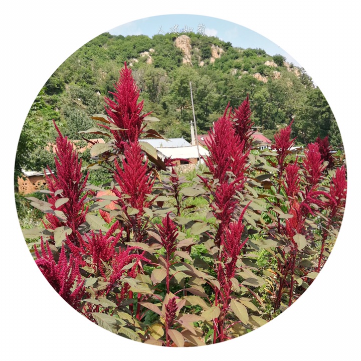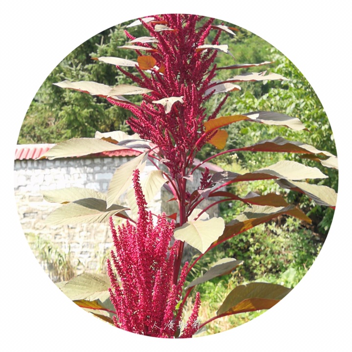 千穗谷(Amaranthus hypochondriacus L.)别称粒粒苋。苋科苋属一年生草本;茎绿色或紫红色,分枝,无毛或上部微有柔毛。叶片菱状卵形或矩圆状披针形,具凸尖,基部楔形,无毛,上面常带紫色;叶柄无毛。圆锥花序顶生,直立,圆柱形,不分枝或分枝,由多数穗状花序形成,花簇在花序上排列极密;苞片绿色或紫红色,背部中脉隆起;花被片矩圆形,绿色或紫红色。胞果近菱状卵形,环状横裂,绿色,上部带紫色,超出宿存花被。种子近球形,白色,边缘锐。花期7-8月,果期8-9月。