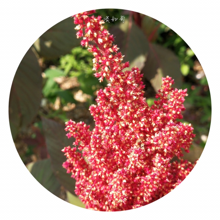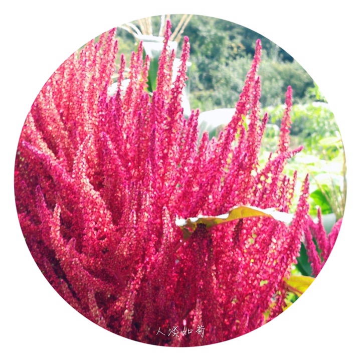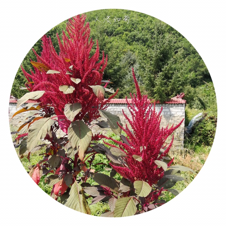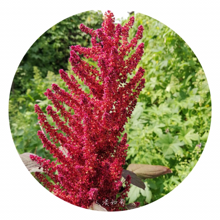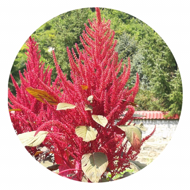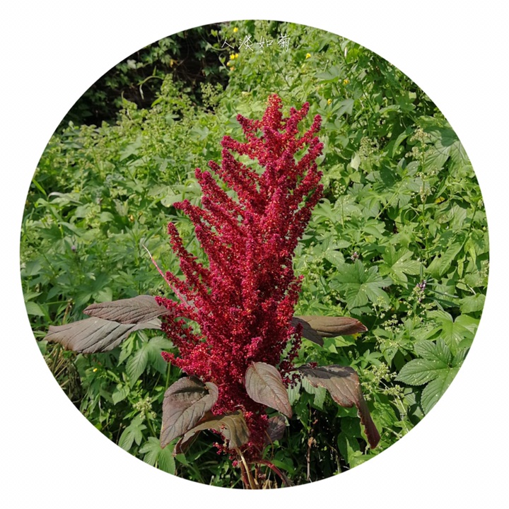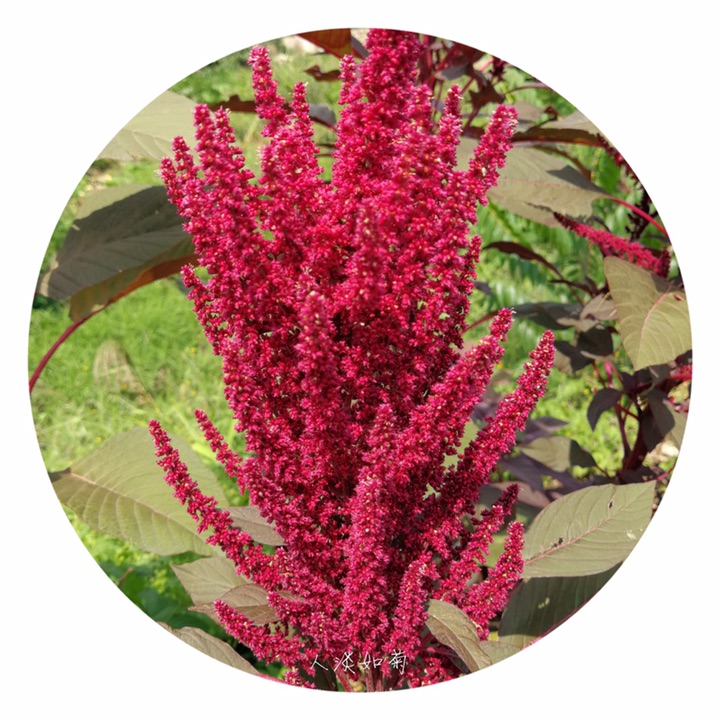 千穗谷(Amaranthus hypochondriacus L.)别称粒粒苋。苋科苋属一年生草本;茎绿色或紫红色,分枝,无毛或上部微有柔毛。叶片菱状卵形或矩圆状披针形,具凸尖,基部楔形,无毛,上面常带紫色;叶柄无毛。圆锥花序顶生,直立,圆柱形,不分枝或分枝,由多数穗状花序形成,花簇在花序上排列极密;苞片绿色或紫红色,背部中脉隆起;花被片矩圆形,绿色或紫红色。胞果近菱状卵形,环状横裂,绿色,上部带紫色,超出宿存花被。种子近球形,白色,边缘锐。花期7-8月,果期8-9月。