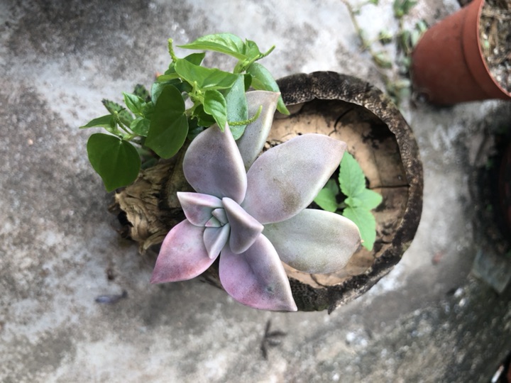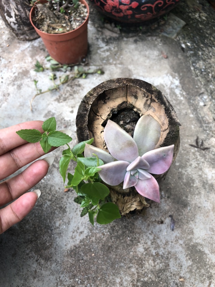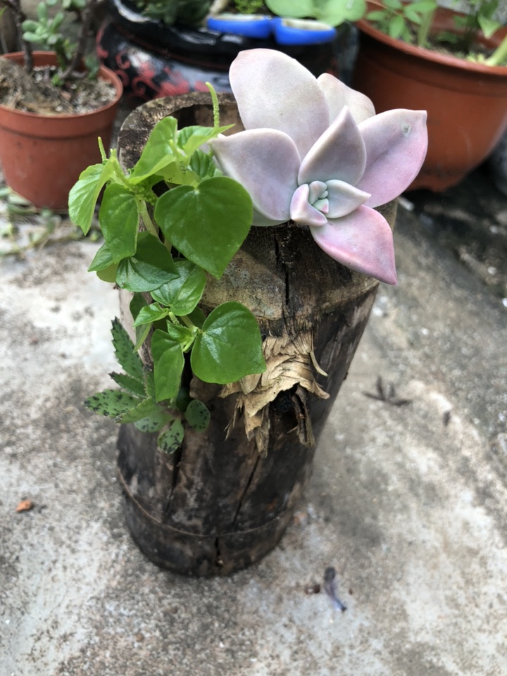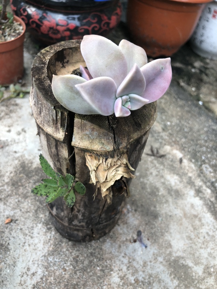 :应该不是,紫乐我也种了!叶子比这个圆一点点!我丢了片叶子在这竹盆里!半年长这样我也不确定它是什么,特别的像:初恋,😊