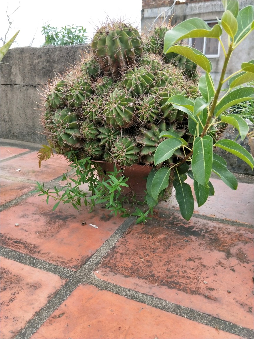 从仙人掌旁长出了一颗植物,不知道是什么
