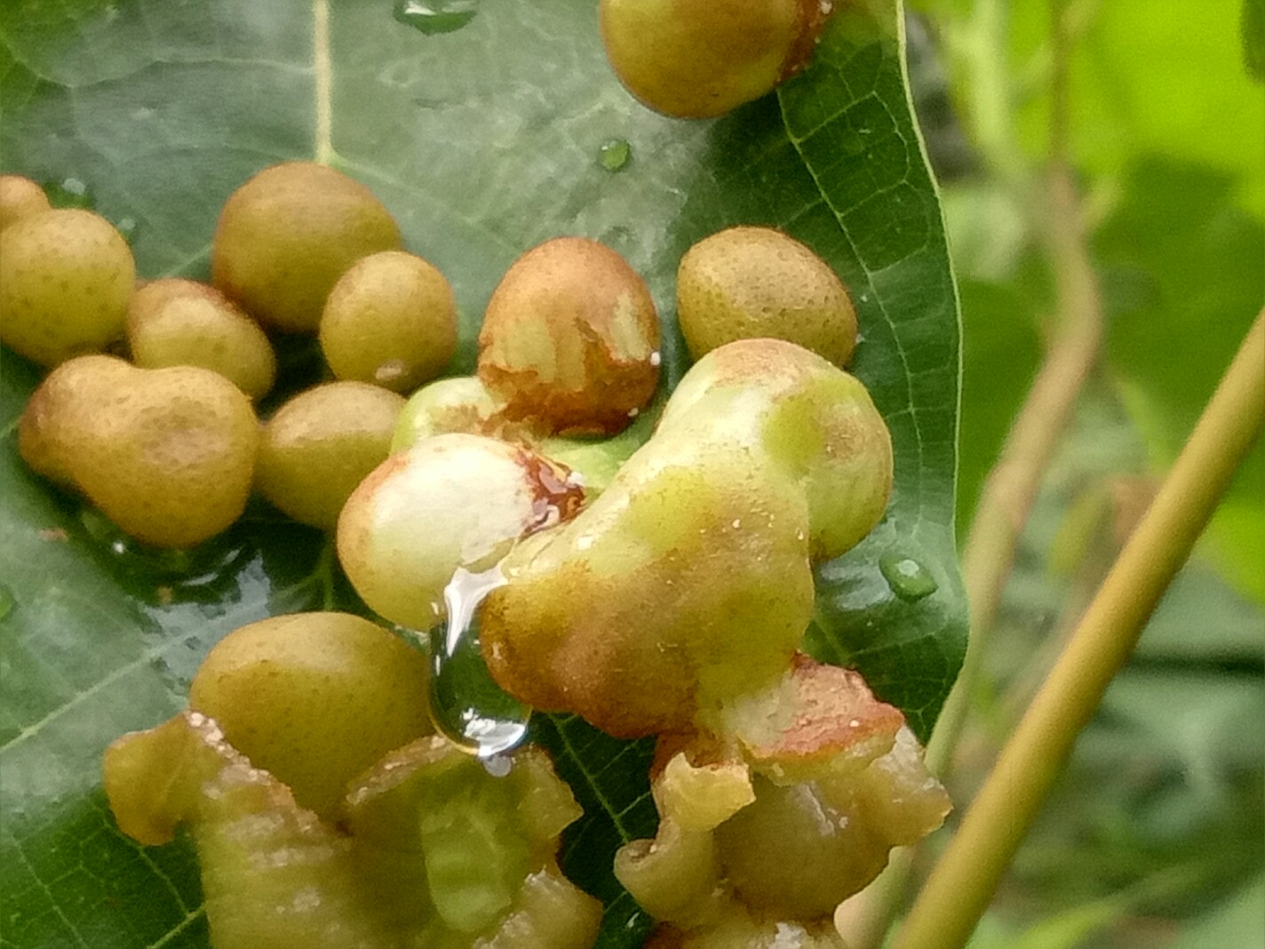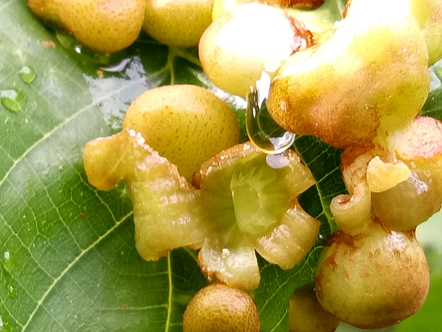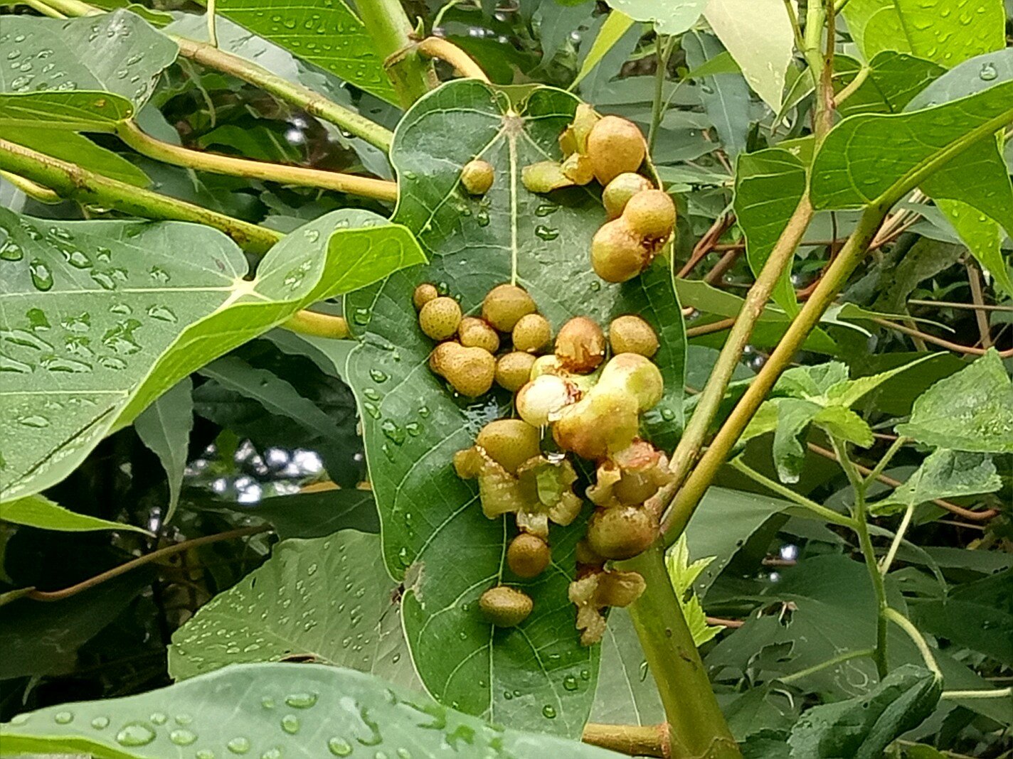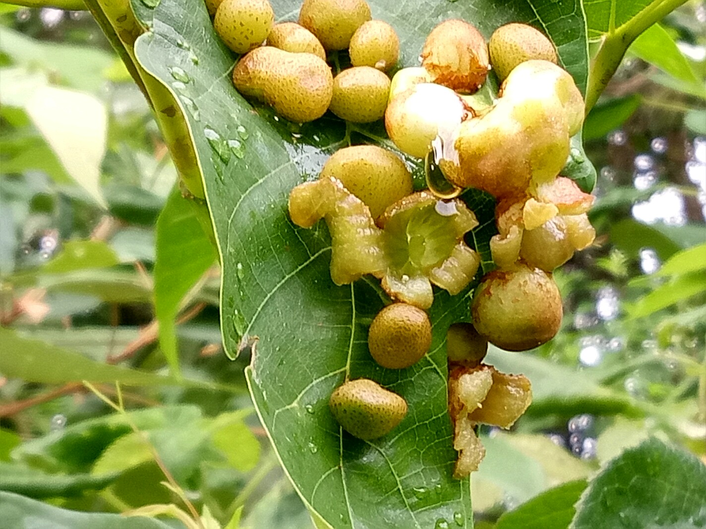 今天早上拍了一小树,树叶表面生了一堆瘤一样的东西,其中一瘤开的却是花。有谁知道这树或这花?(不是只有一片树叶是这样,有的长两粒,但还未开。