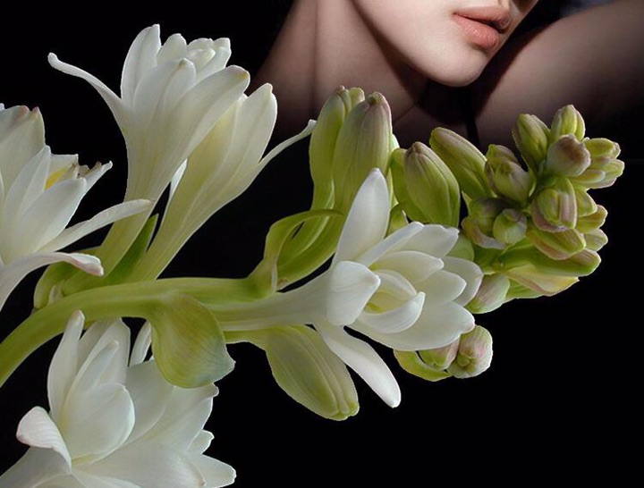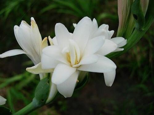 晚香玉(学名:Polianthes tuberosa L.)是石蒜科,晚香玉属多年生草本植物,高可达1米。茎直立,不分枝。基生叶片簇生,线形,顶端尖,深绿色,在花茎上的叶散生,向上渐小呈苞片状。穗状花序顶生,每苞片内常花,苞片绿色;花乳白色,浓香,花被裂片彼此近似,长圆状披针形,子房下位,花柱细长,蒴果卵球形,种子多数,稍扁。7-9月开花。