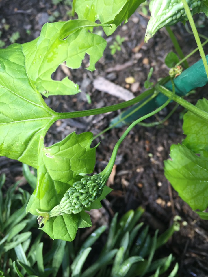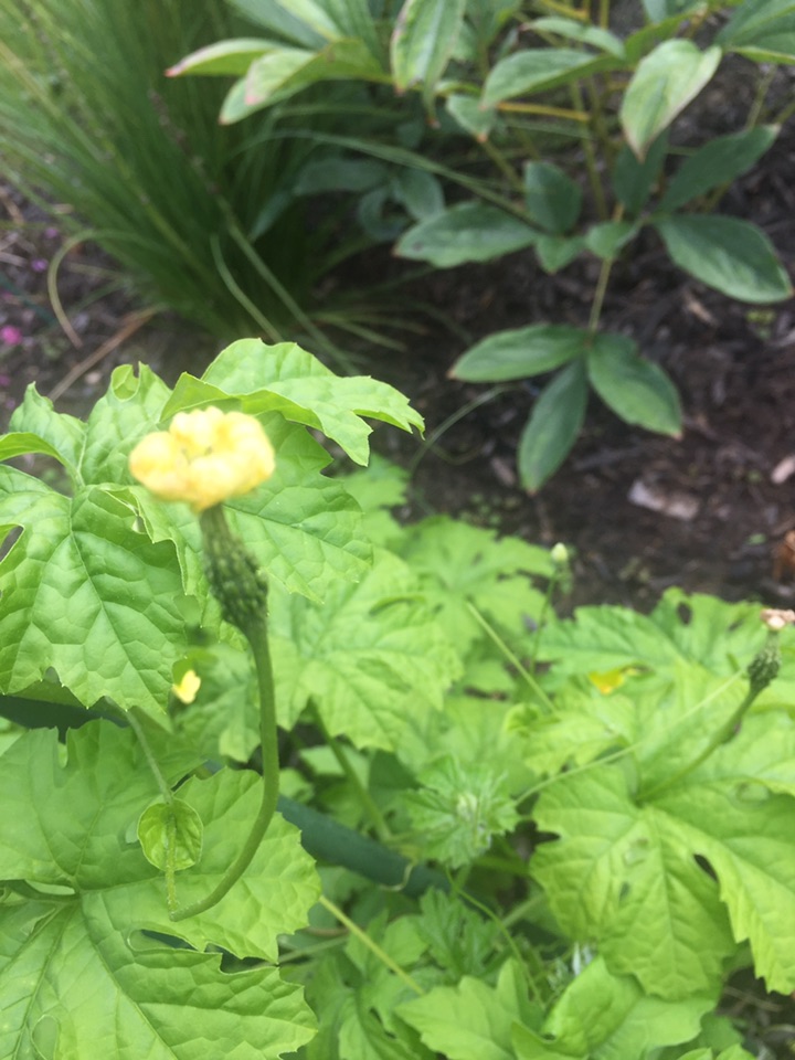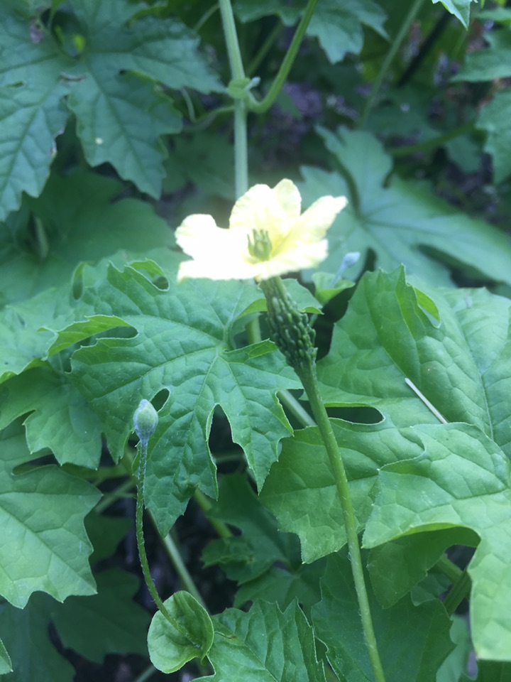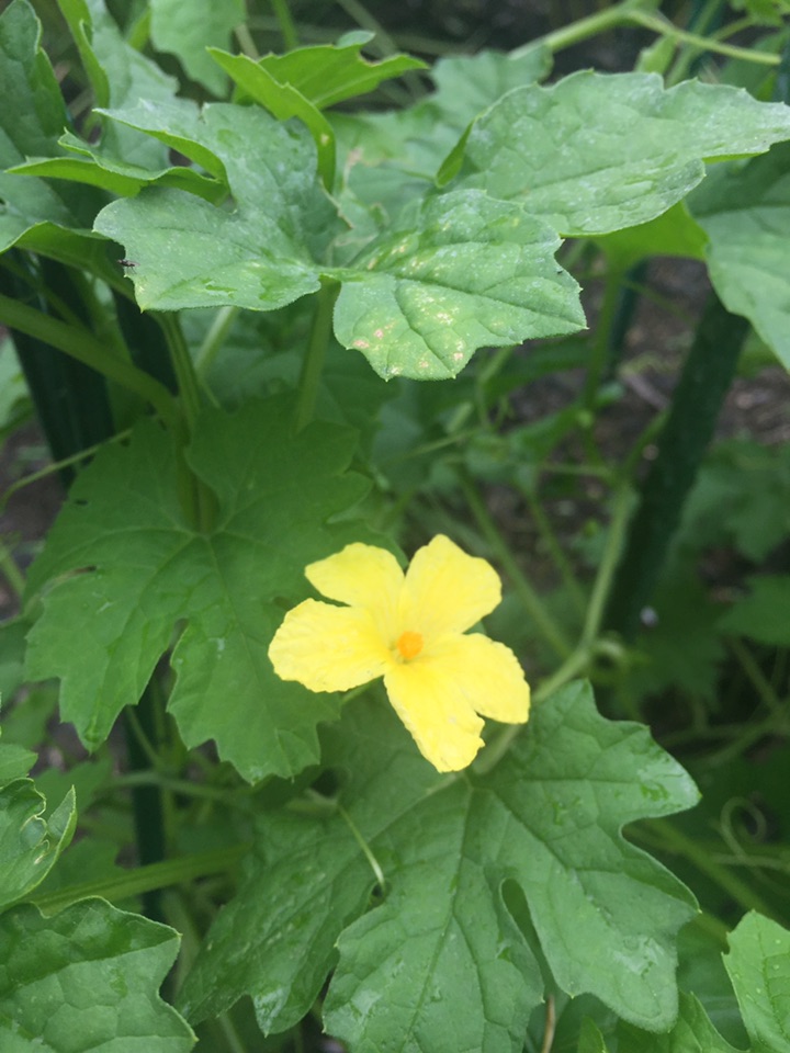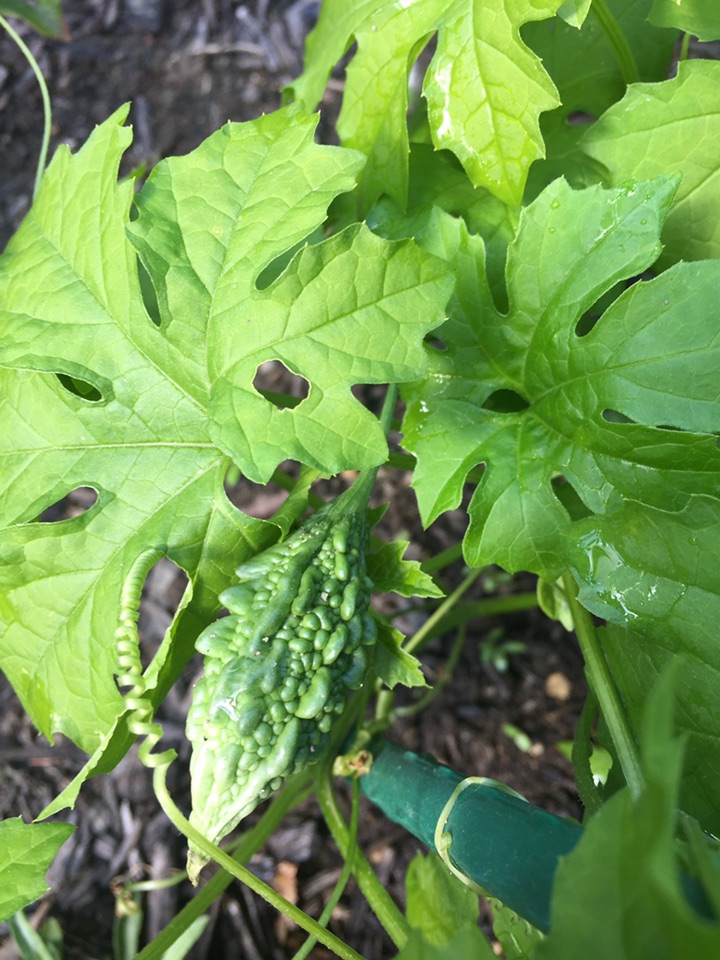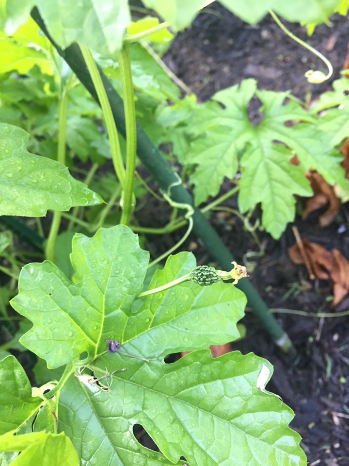 第一次种苦瓜 朋友给的种子 春末刚开始育苗时长得很不错 可惜移出去太早 被冻坏了;再接再厉,第二次育苗依然很成功,移栽到deck旁边 长了一段时间发现长得太慢了 朋友说必须要在full sun的spot 所以又移了一次 换到能阳光普照的花园前侧 只是已为时已晚已近八月了 虽然现在长得不错、结了好多徽细、超级小的苦瓜宝宝 估计是已经来不及长大了吧?!