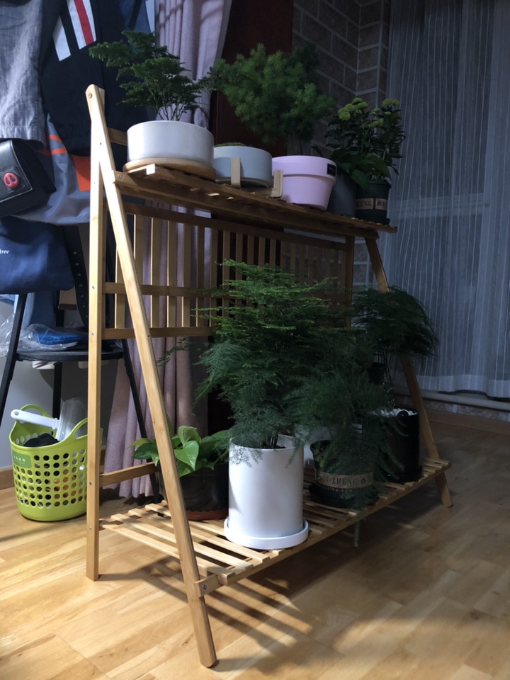 刚买的楠竹花架,路上一星期,话说最近北京网购快递真的慢好多呀,70年国庆安检好严格,一到秋天天气凉了就各种买买买花,今年有点途囧,鲜活的东西还是建议70大庆以后买,顺便祝祖国母亲生日快乐言归正题,花架安装了二十分钟,腿都蹲麻了,弄好把花花们摆上,慢慢的成就感呀心情舒畅,文竹 乒乓菊 蓬莱松 绿箩 云竹苔藓,貌似忘了还有两盆墨兰,架子买小了,一脸懵逼中……