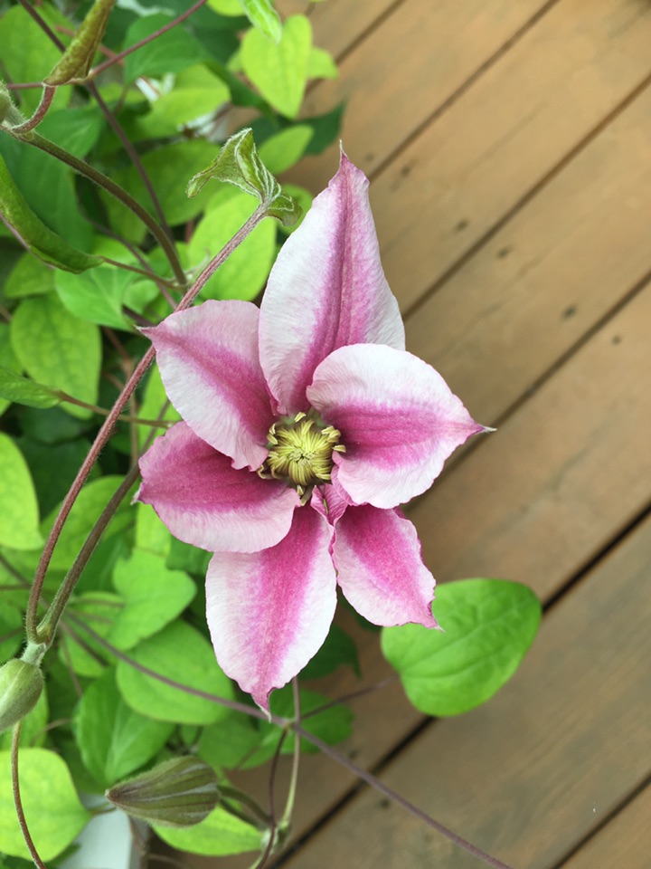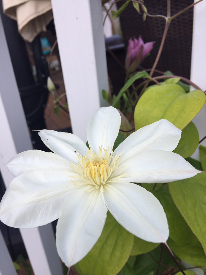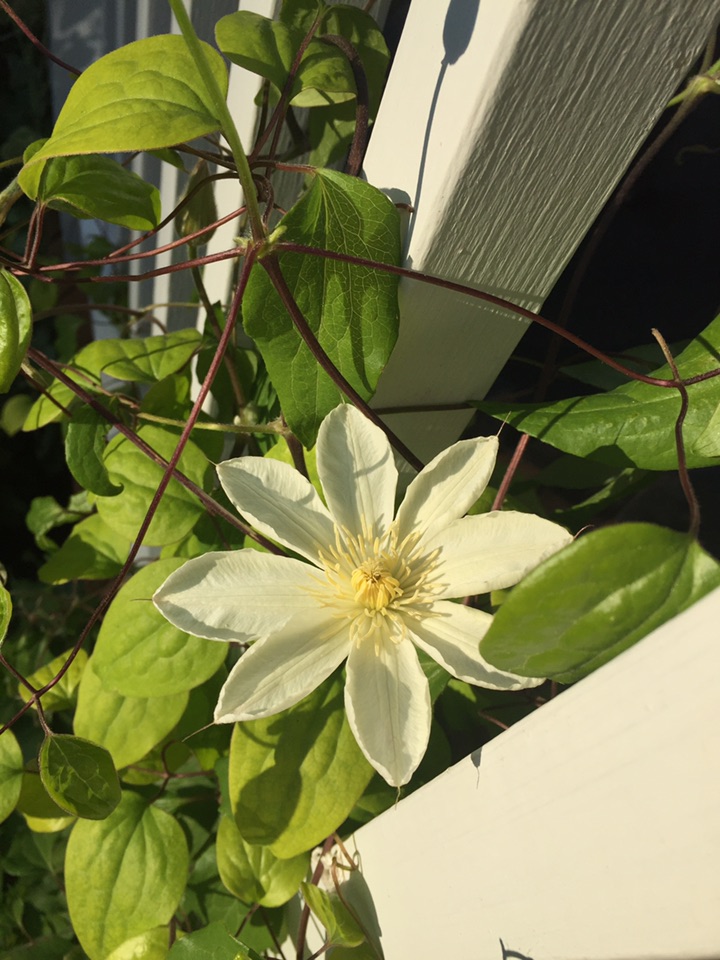 早花的铁线莲在这秋意渐浓之时又一次开花啦!这可得完全归功于一次无意中看到的、关于铁线莲修剪的视频 - 那个花艺师大刀阔斧地剪掉了绝大部份的、刚开完花的铁线莲 只剩下秃秃的底部枝藤 - 看得我直咂舌,剪得太多了吧?! 虽然不敢剪那么多,但受到启发,也大着胆子大修剪了一番;提心吊胆地等了这一个多月 终于看到结果了!看来以后真是可以好好修剪、再早一点儿修剪