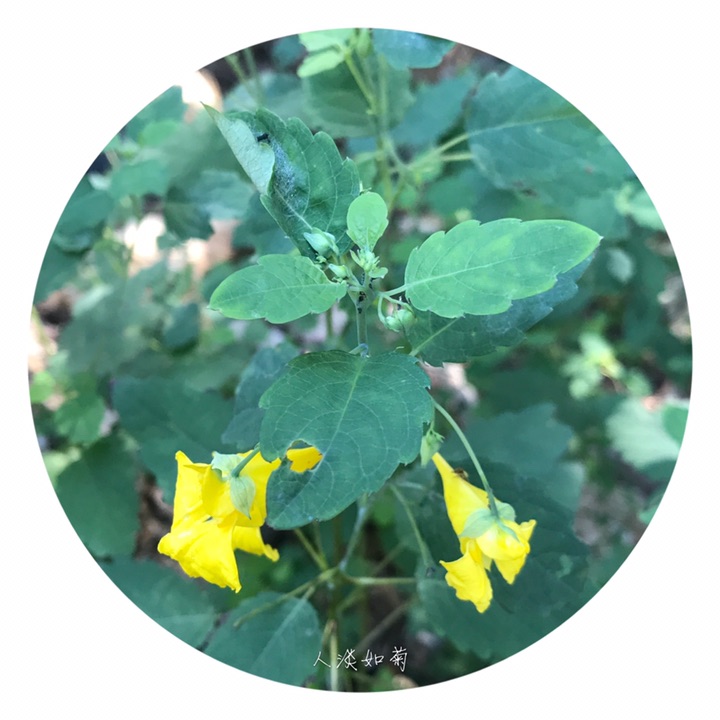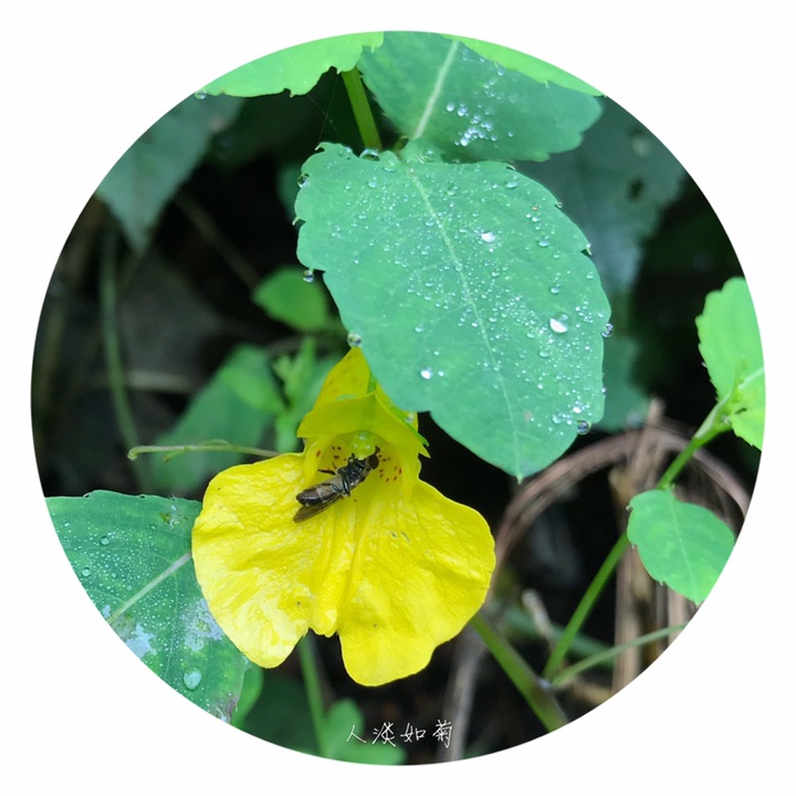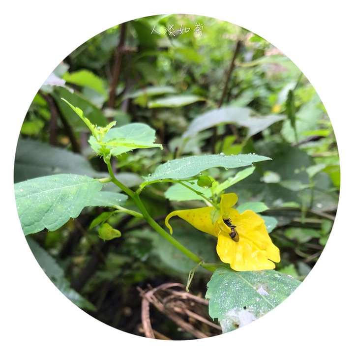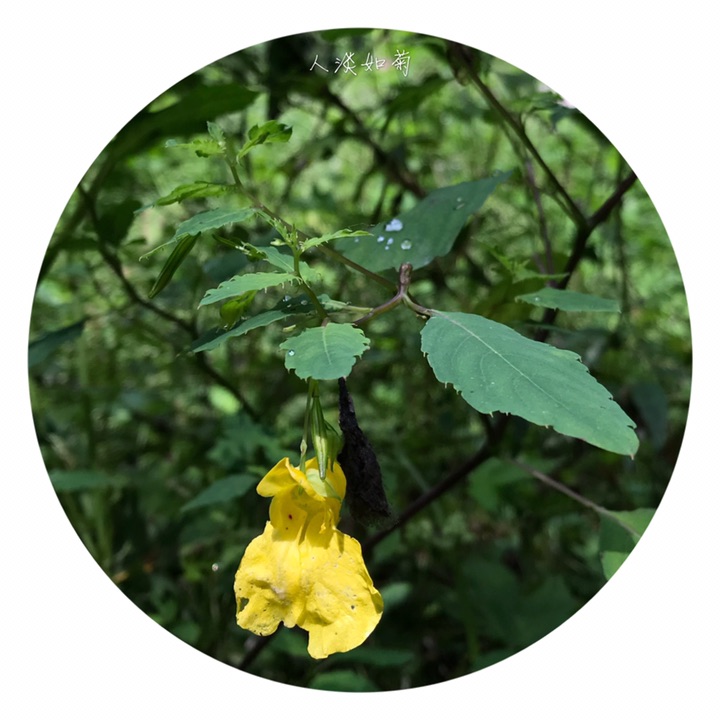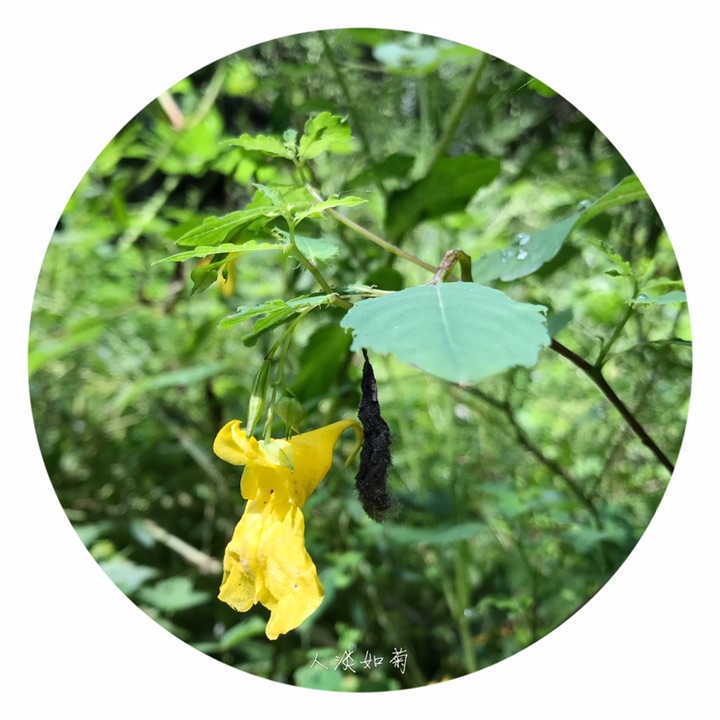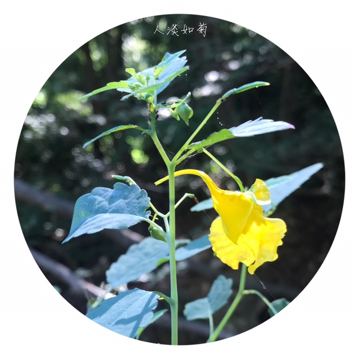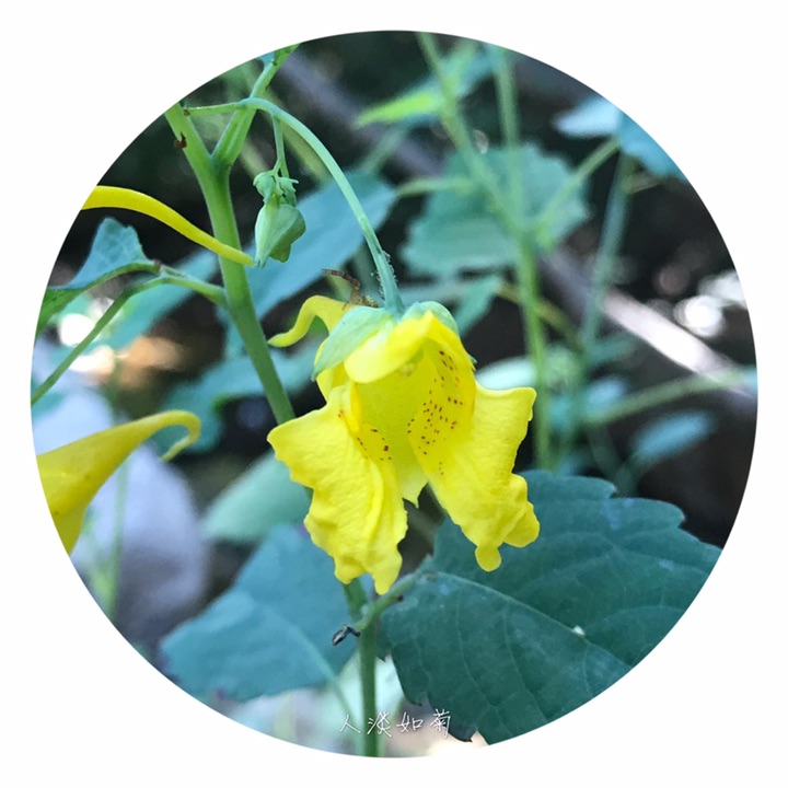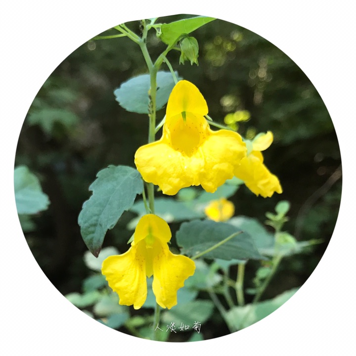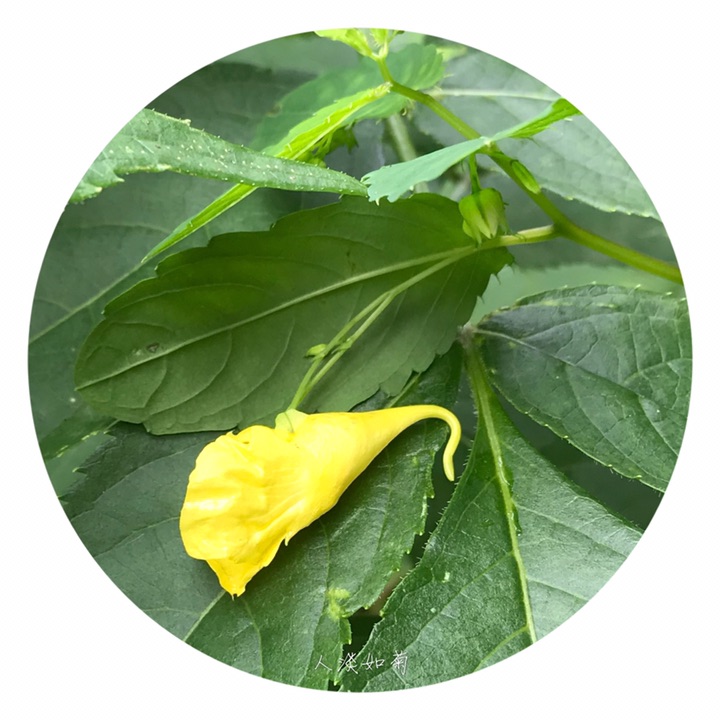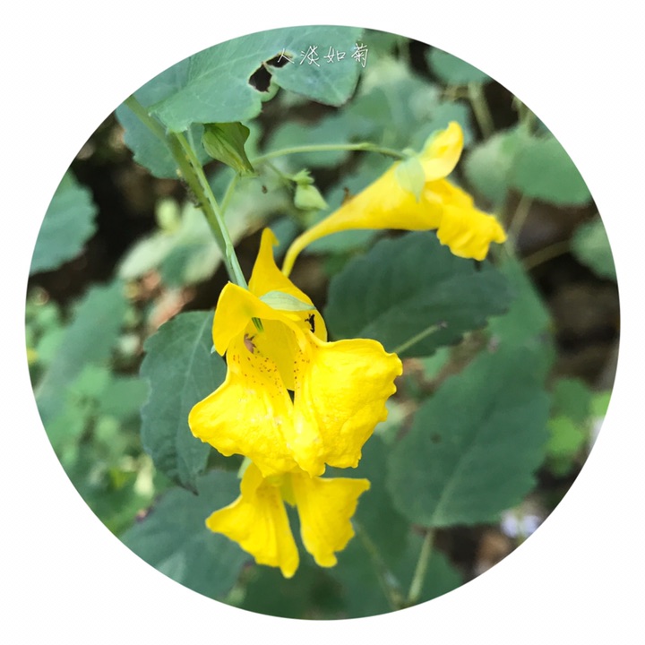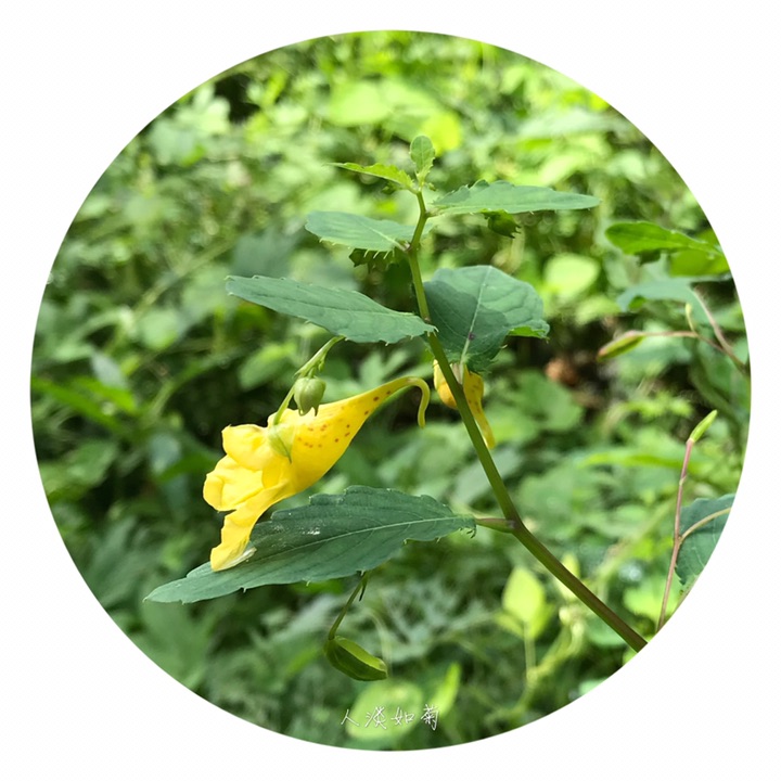 一年生草本,高40-70厘米。茎较粗壮,肉质,直立,上部多分枝,无毛,下部节常膨大,有多数纤维状根。叶互生;叶片卵形或卵状椭圆形,长3-8厘米,宽1.5-4厘米,先端钝,稀急尖,基部圆钝或宽楔形,边缘有粗圆齿状齿,齿端具小尖,两面无毛,上面深绿色,下面灰绿色;叶柄纤细,长2-5厘米。最上部的叶柄更短或近无柄。总花梗长1-1.5厘米,具2-4花,排列成总状花序;花梗长1.5-2毫米,中上部有1枚苞片;苞片草质,披针形,长3-5毫米,宿存;花黄色;侧生2萼片卵形或宽卵形,长5-6毫米,先端急尖;旗瓣圆形或近圆形,直径约10毫米,先端微凹,背面中肋具绿色鸡冠状突起,顶端具短喙尖;翼瓣无柄,长20-25毫米,2裂,下部裂片小,长圆形,上部裂片宽斧形,近基部散生橙红色斑点,外缘近基部具钝角状的小耳;唇瓣宽漏斗状,喉部散生橙红色斑点,基部渐狭成长10-15毫米内弯的距。雄蕊5,花丝线形,上部稍膨大,花药卵球形,顶端尖;子房纺锤形,直立,具短喙尖。蒴果线状圆柱形,长1.5-2.5厘米。种子多数,长圆球形,长3-4毫米,褐色,光滑。花期7-9月。