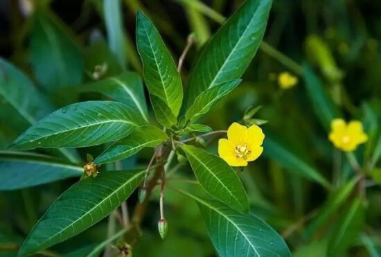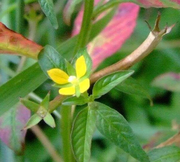 丁香蓼,别名:小石榴树、小石榴叶、小疗药,拉丁文名:Ludwigia prostrata Roxb.,是桃金娘目、柳叶菜科、丁香蓼属一年生直立草本;茎高25-60厘米,粗2.5-4.5毫米,下部圆柱状,上部四棱形,常淡红色,近无毛,多分枝,小枝近水平开展。叶狭椭圆形,先端锐尖或稍钝,基部狭楔形,在下部骤变窄,开花时以四合花粉直接授在柱头上;柱头近卵状或球状,顶端稍偏斜,具小尖头,表面有横条排成的棕褐色纵横条纹;种脊线形,花期6-7月,果期8-9月。