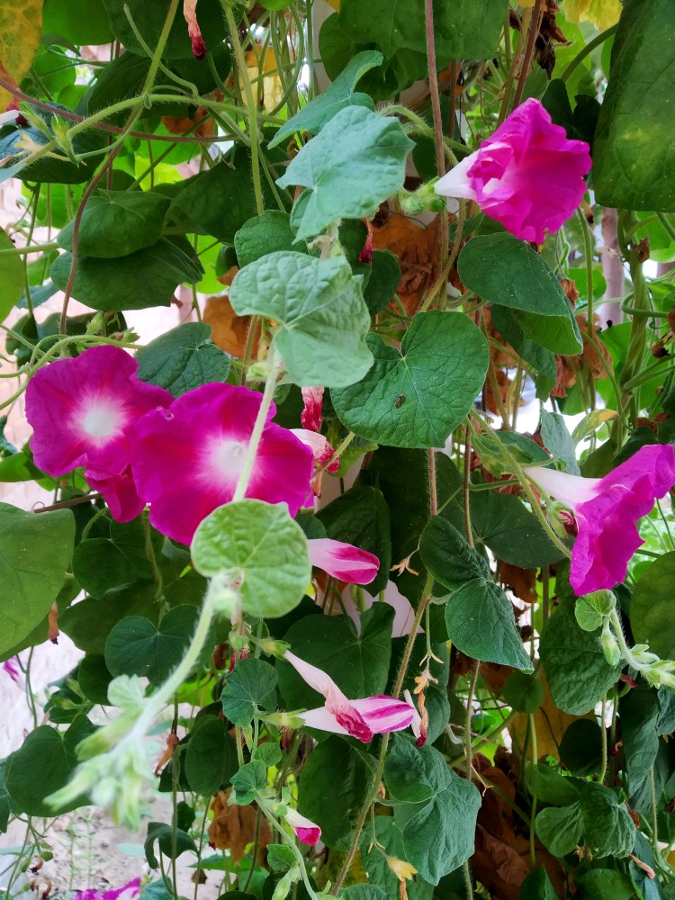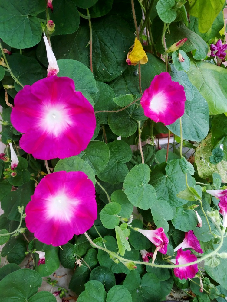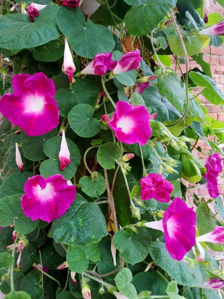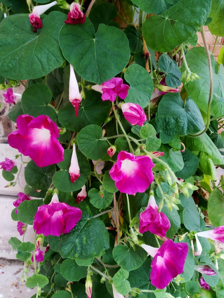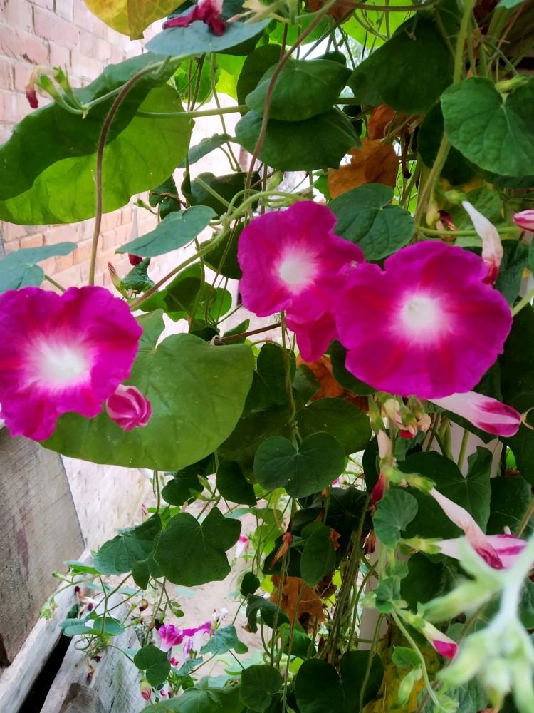 这颗以前叶子很旺的牵牛花,被我把缠在它身上的小野花扒掉后,一直不旺,开花也零零星星的,这几天又恢复了元气,开出巨量的花朵,单朵也很大: