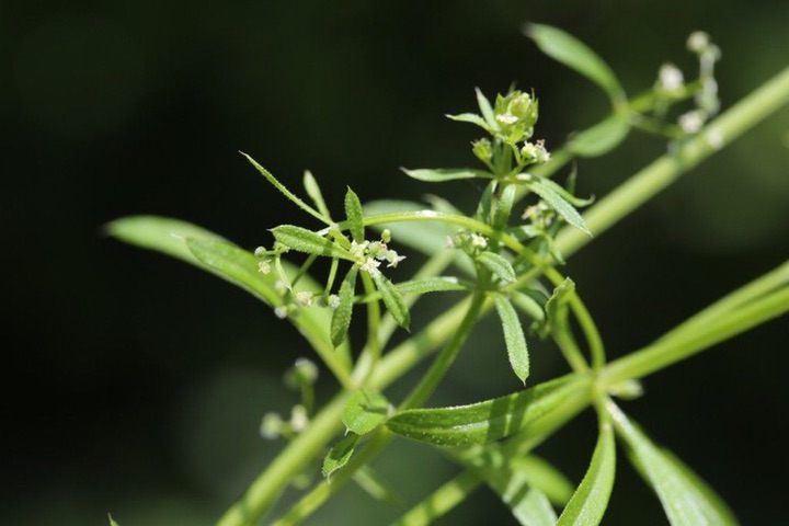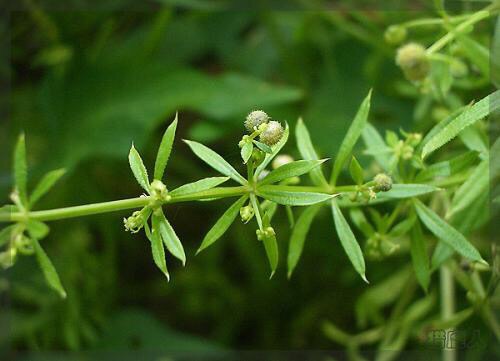 拉拉藤(变种)又名猪殃殃、爬拉殃、、八仙草。多枝、蔓生或攀缘状草本,通常高30-90厘米;茎有4棱角;棱上、叶缘、叶脉上均有倒生的小刺毛。叶纸质或近膜质,6-8片轮生,稀为4-5片,带状倒披针形或长圆状倒披针形,两面常有紧贴的刺状毛,常萎软状,干时常卷缩,1脉,近无柄。聚伞花序腋生或顶生,少至多花,花小,4数,有纤细的花梗;花萼被钩毛,萼檐近截平;花冠黄绿色或白色,辐状,裂片长圆形,镊合状排列;子房被毛,花柱2裂至中部,柱头头状。果干燥,有1或2个近球状的分果爿,肿胀,密被钩毛,果柄直,较粗,每一爿有1颗平凸的种子。花期3-7月,果期4-11月。