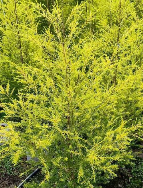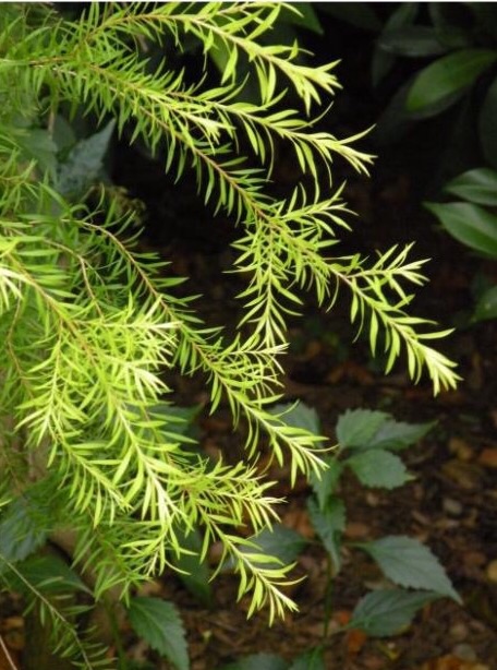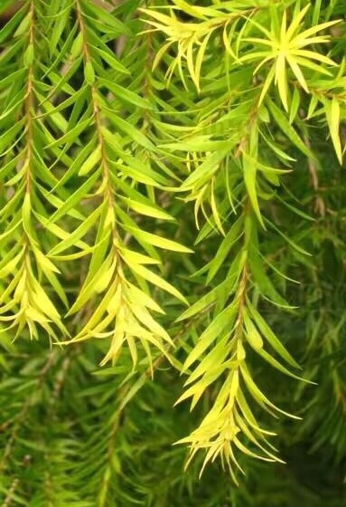 黄金串钱柳为桃金娘科白千层属常绿乔木,在广州,叶片秋、冬、春三季表现为金黄色,夏季由于温度较高为鹅黄色。1999年由新西兰首次引入我国。深根性树种,主干直立,枝条细长柔软,嫩枝红色,且韧性很强。抗风力强,在海边长势非常好。不仅可用于庭园案观、道路美化(用于行车道隔离带、人行道隔离带的造型小乔禾或行道树)、小区绿化,还可用于林相改造;同时,由于其抗盐碱、耐强风的特性,非常适于海滨及人工填海造地的绿化造莆、防风固沙等叶片芳香宜人,其含的芳香油是目前世界上珍贵的化妆品香料之一。