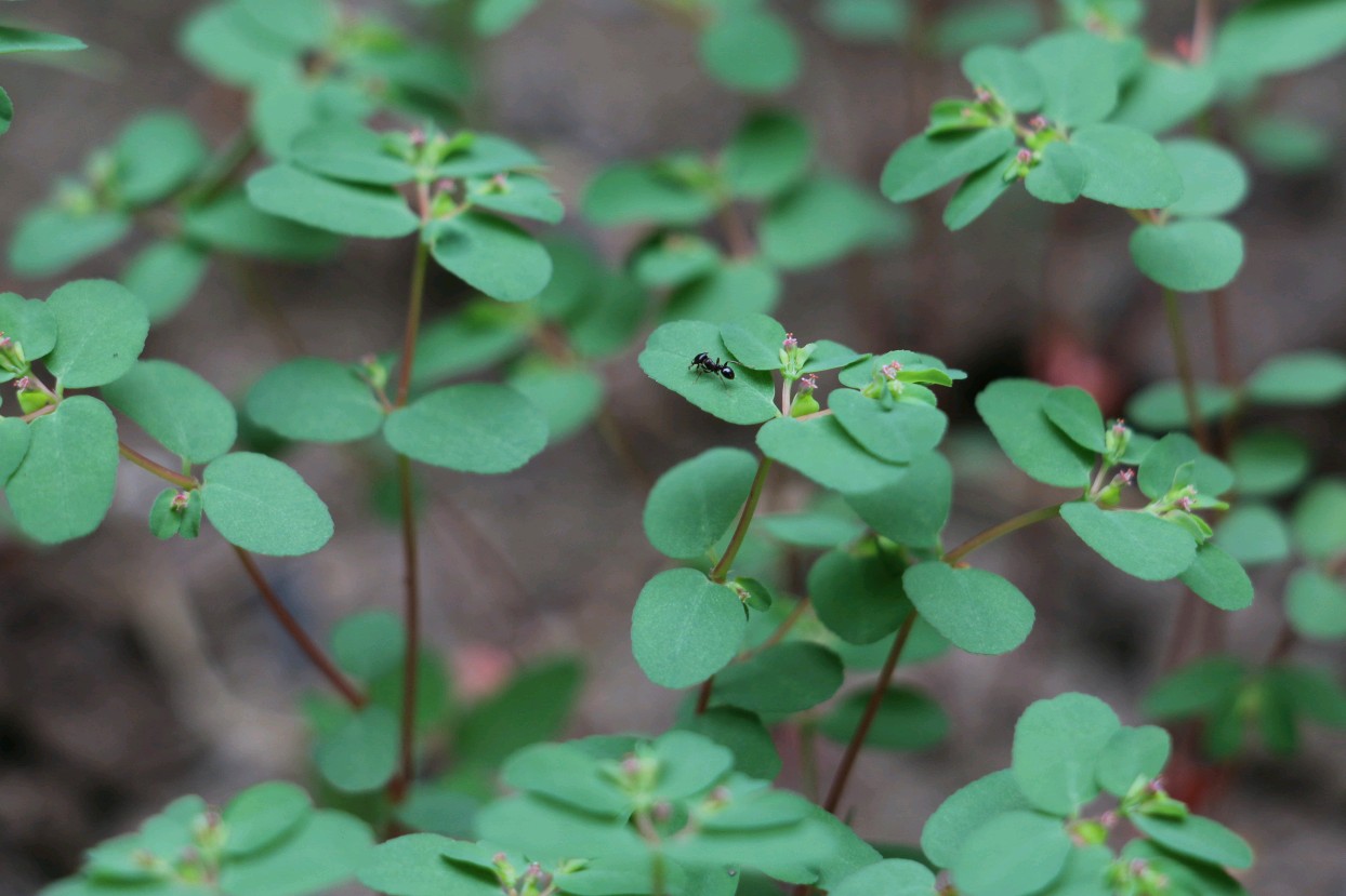 地锦草是一年生草本,含白色乳汁。茎通常从根际成二歧分生为数枝,平卧地面,呈红色,通常无毛。叶2列对生:椭圆形,长5~10毫米,宽4~6毫米,先端圆,基部不等形,边缘有细锯齿,上面绿色,下面绿白色;叶柄极短;托叶线形,通常3深裂。杯状聚伞花序,单生于枝腋或叶腋;总苞倒圆锥形,淡红色,边缘4裂;腺体4枚,椭圆形;雄花数朵和雌花1朵同生于总苞内;雄花仅雄蕊1;雌花位于花序中央,子房有长柄,3室,花柱3,2裂。蒴果扁卵形而小,有3棱,无毛。种子卵形。花期6-10月,果实7月渐次成熟。生于平原、荒地、路旁及田间,为习见杂草。除广东、广西外,分布几遍全国各地。