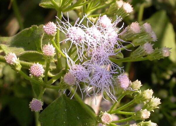 飞机草(学名:Eupatorium odoratum L.):是多年生草本植物,根茎粗壮,横走。茎直立,高1-3米,苍白色,有细条纹;分枝粗壮,常对生,叶对生,卵形、三角形或卵状三角形,花序下部的叶小,常全缘。头状花序多数或少数在茎顶或枝端排成复伞房状或伞房花序,总苞圆柱形,总苞片3-4层,覆瓦状排列,外层苞片卵形,麦杆黄色。花白色或粉红色。瘦果黑褐色,5棱,花果期4-12月。