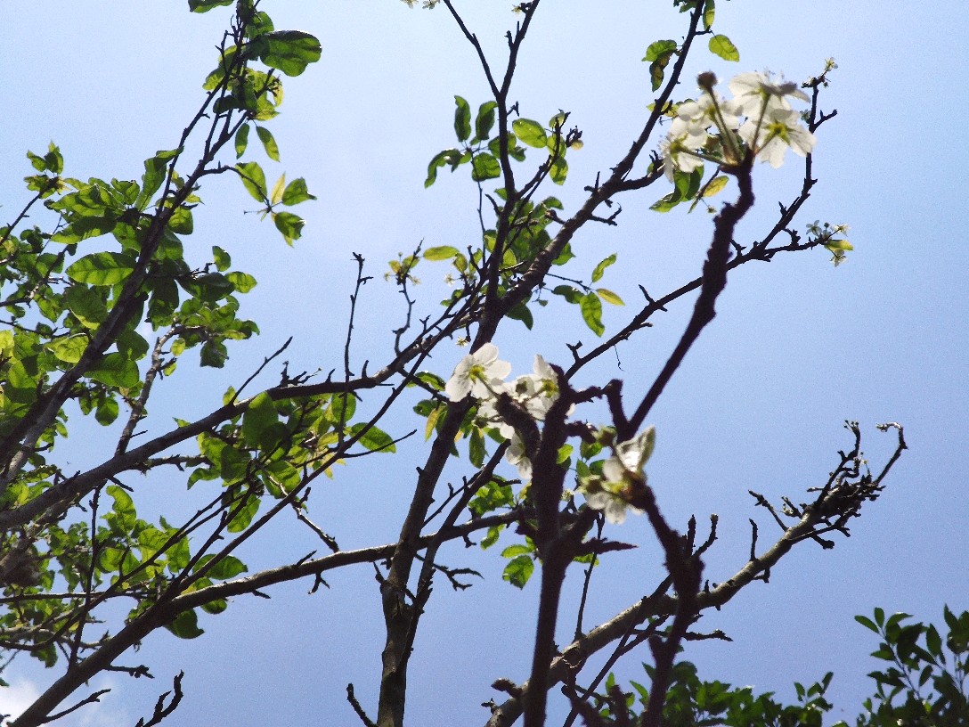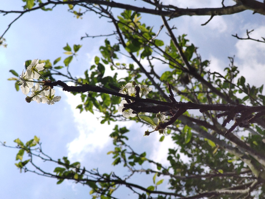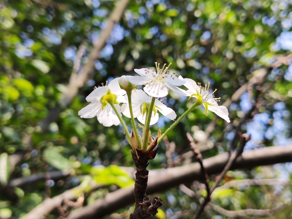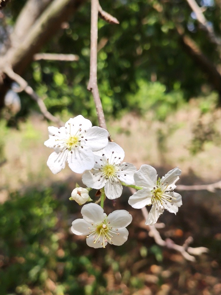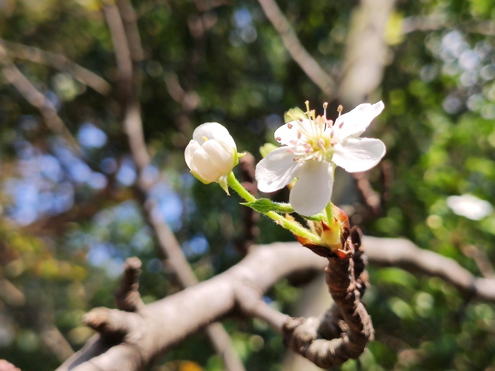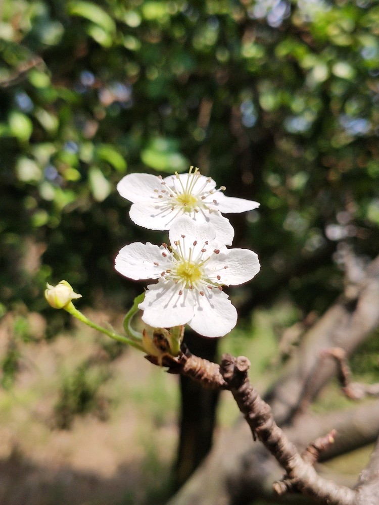 可能是阳光没门前的足,屋后的这棵梨树现在才开花呢