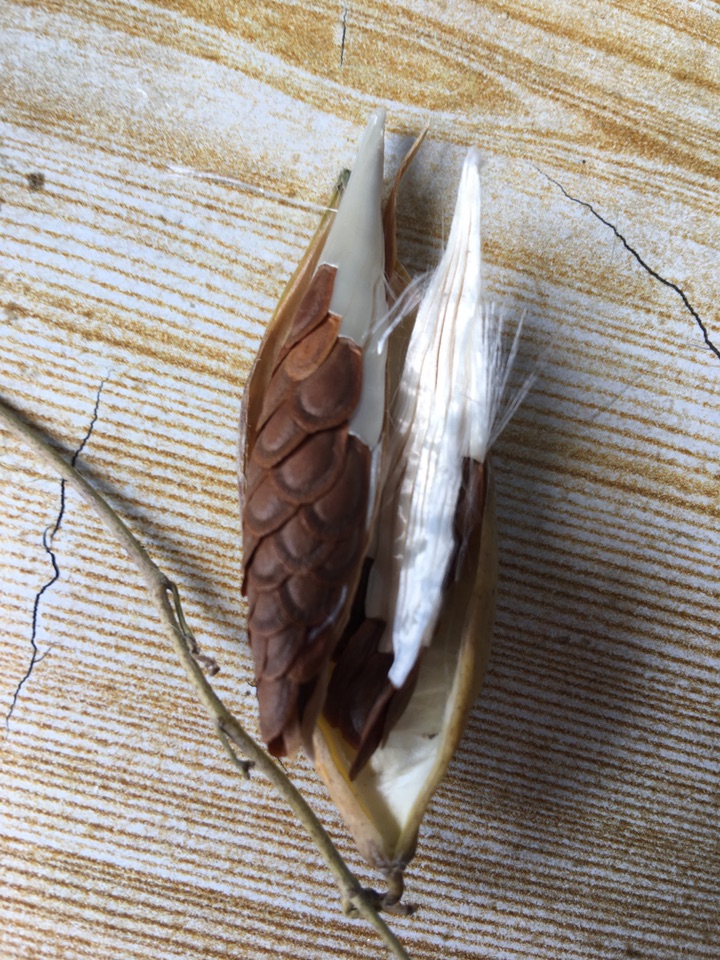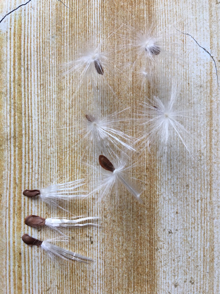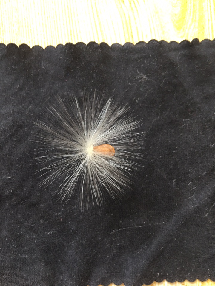 我摘了几个留作种子,轻轻剥开了一个,发现它的种子很奇特,整体看来像一个精致的小松果。拆开看,每一粒种子都像个不规则的榆钱,一头圆润,另一头稍窄,而且长着一束细长的白丝。一会儿,那束白丝就蓬松起来,十分圆润可爱。