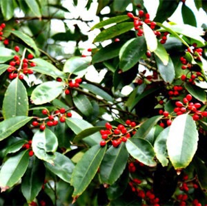 珊瑚冬青(学名:Ilex corallina Franch.)是冬青科冬青属植物。常绿灌木或乔木,高3-10米;小枝圆柱形,细瘦,具纵棱,淡褐色,无毛或被微柔毛,三年生枝具小的皮孔及稍突起的狭三角形叶痕;叶生于1-3年生枝上,叶片革质,卵形,卵状椭圆形或卵状披针形。花序簇生于二年生枝的叶腋内,总花梗几无,苞片卵状三角形,具缘毛。果近球形;宿存花萼平展。花期4-5月,果期9-10月。
